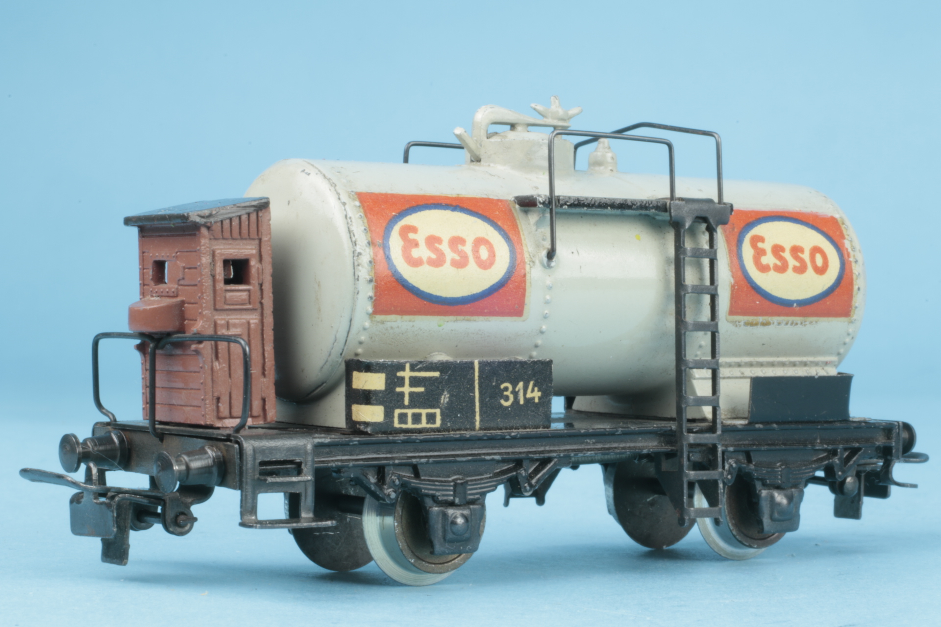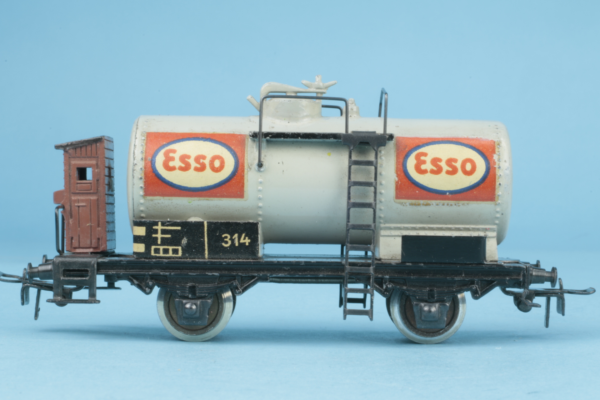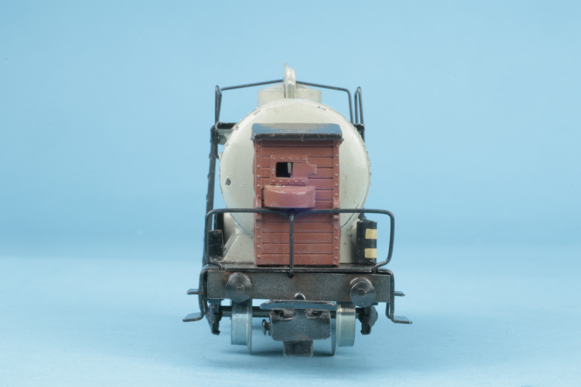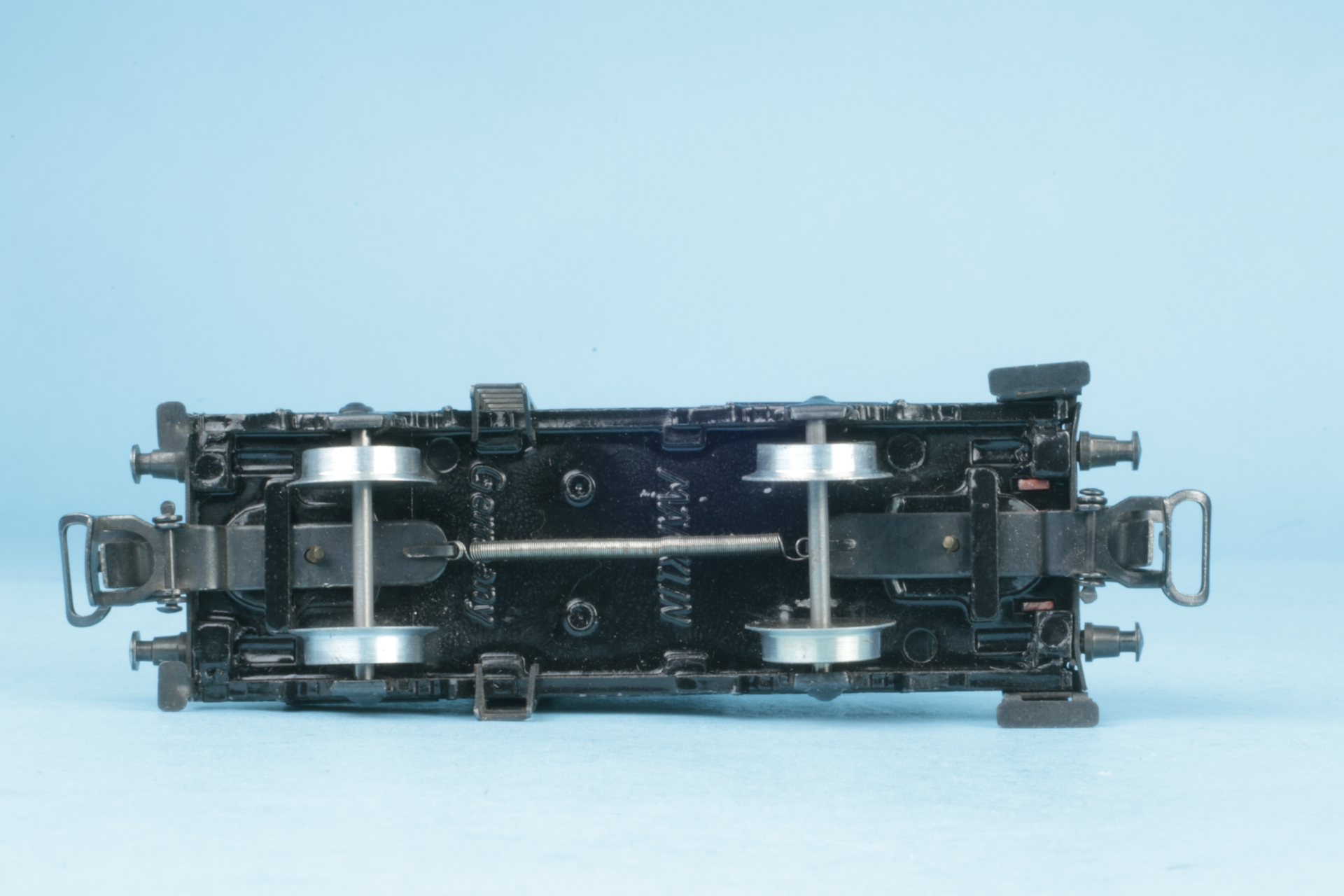 Version without brake shoes. Wheelsets with axle bearing covers. Black wide bow couplings (4.2). Brakeman´s cab with brake spindle. Built around 1949. Minor damages to the paint. Wheelsets replaced by us. Otherwise good original condition. In the original box.