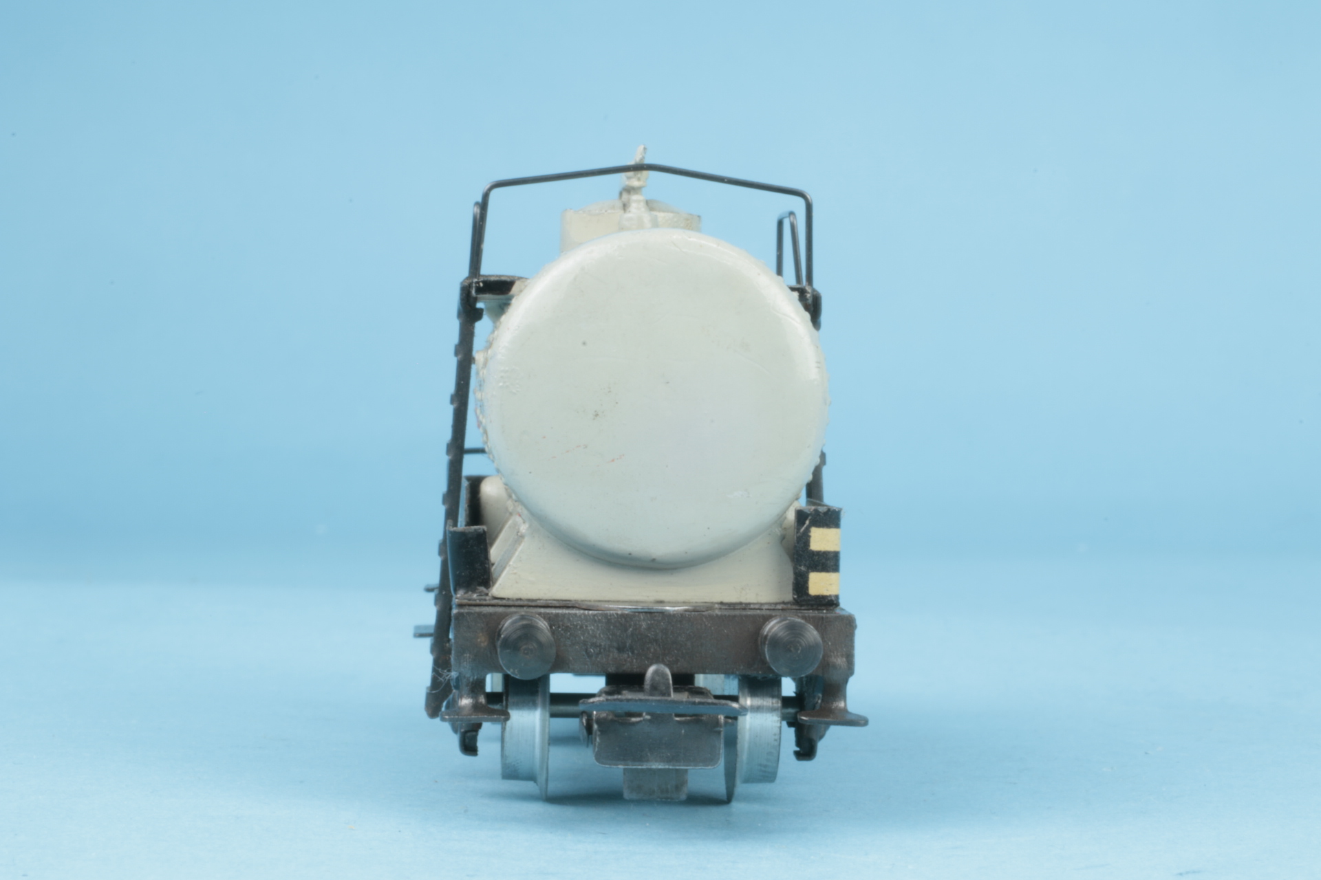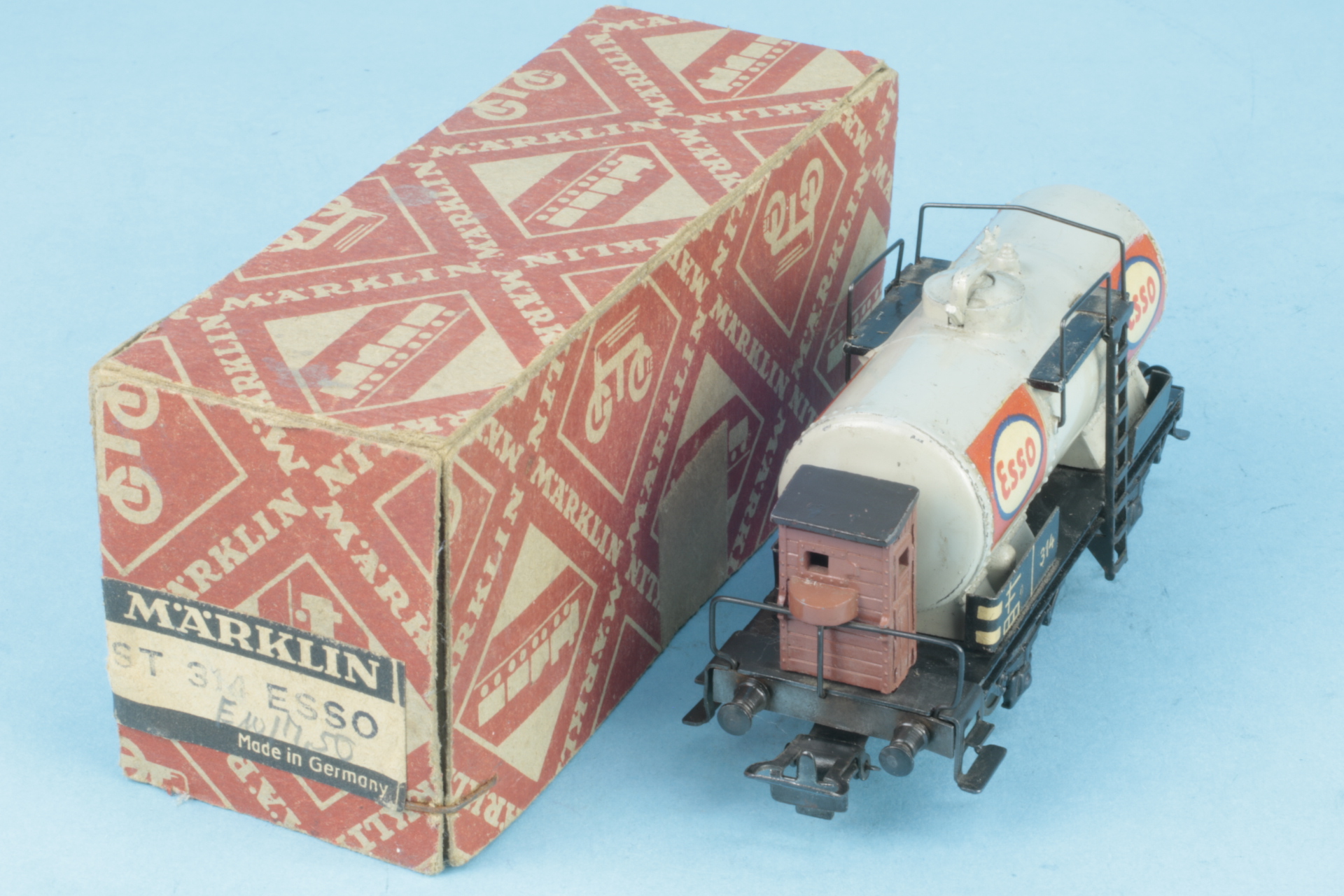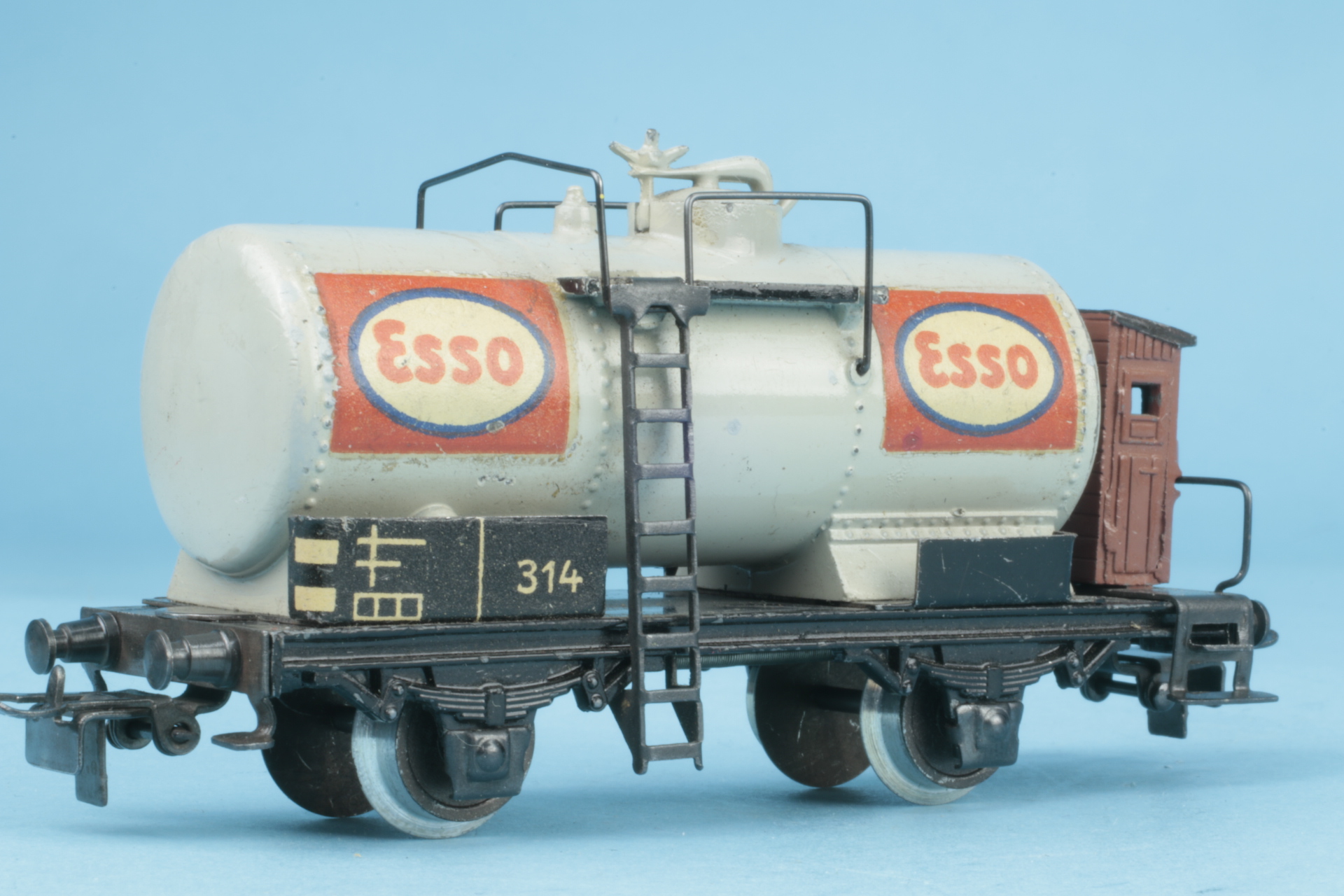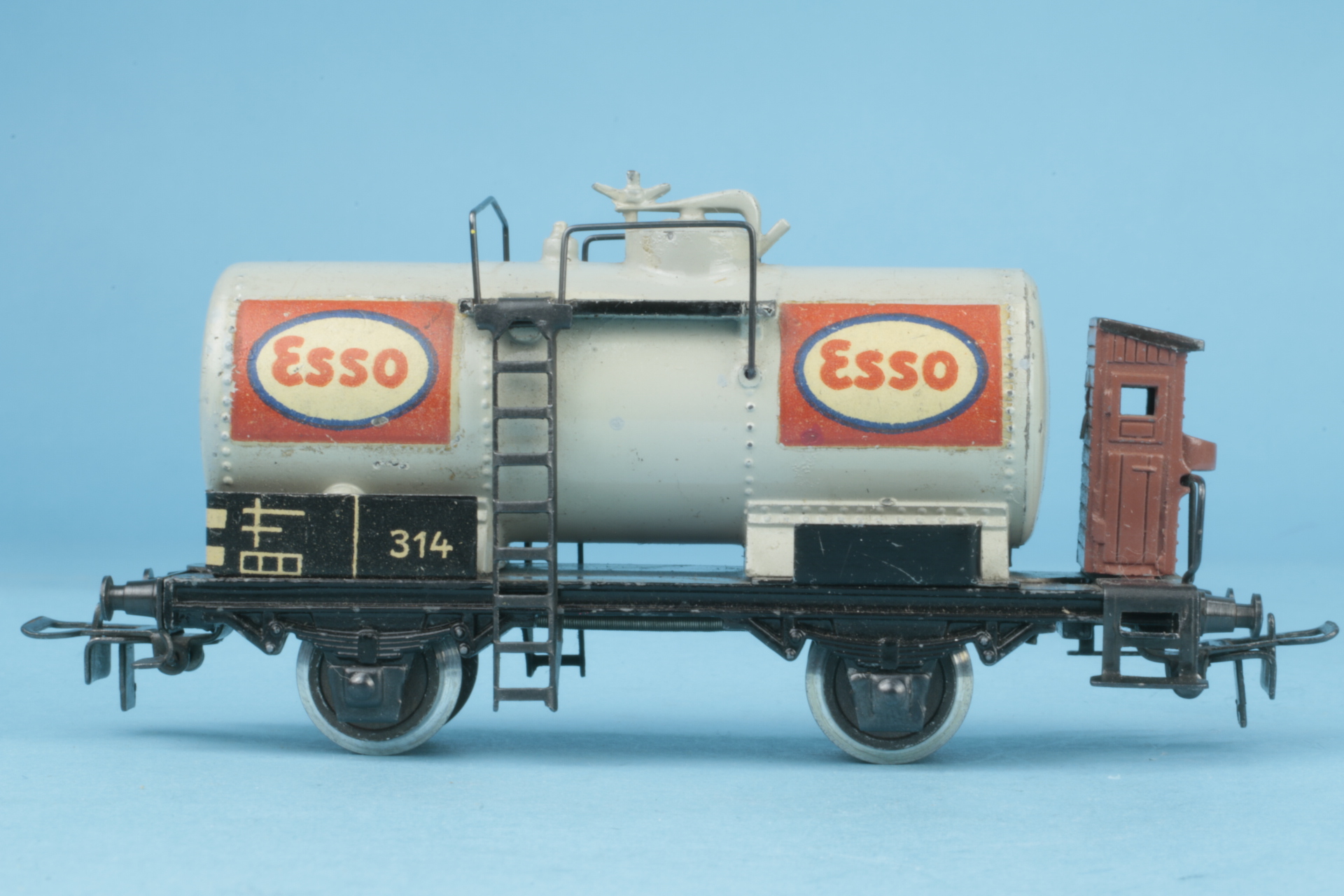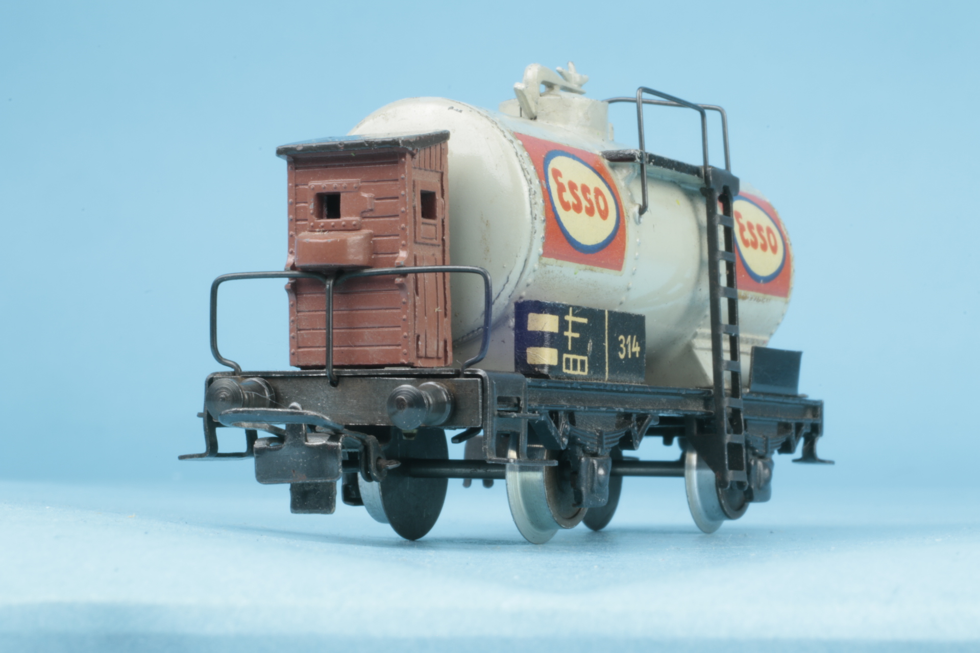 Version without brake shoes. Wheelsets with axle bearing covers. Black wide bow couplings (4.2). Brakeman´s cab with brake spindle. Built around 1949. Minor damages to the paint. Wheelsets replaced by us. Otherwise good original condition. In the original box.