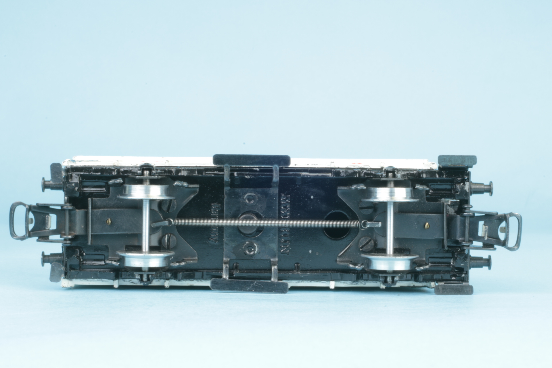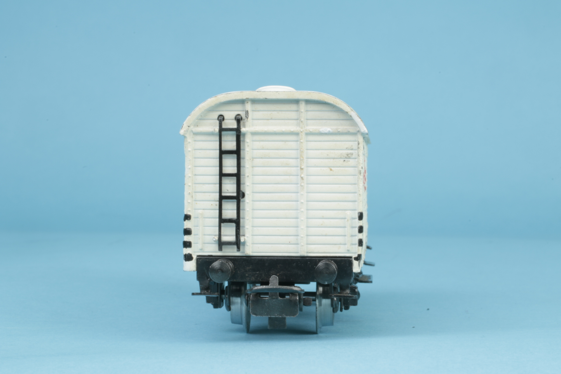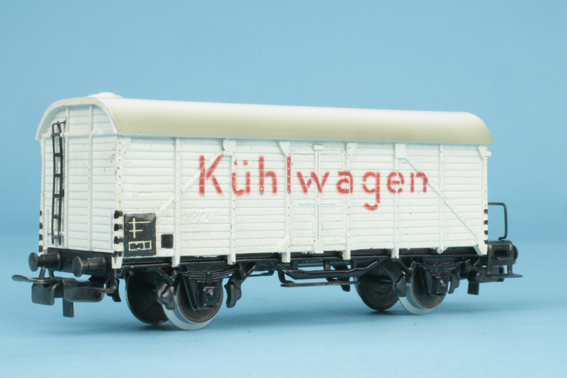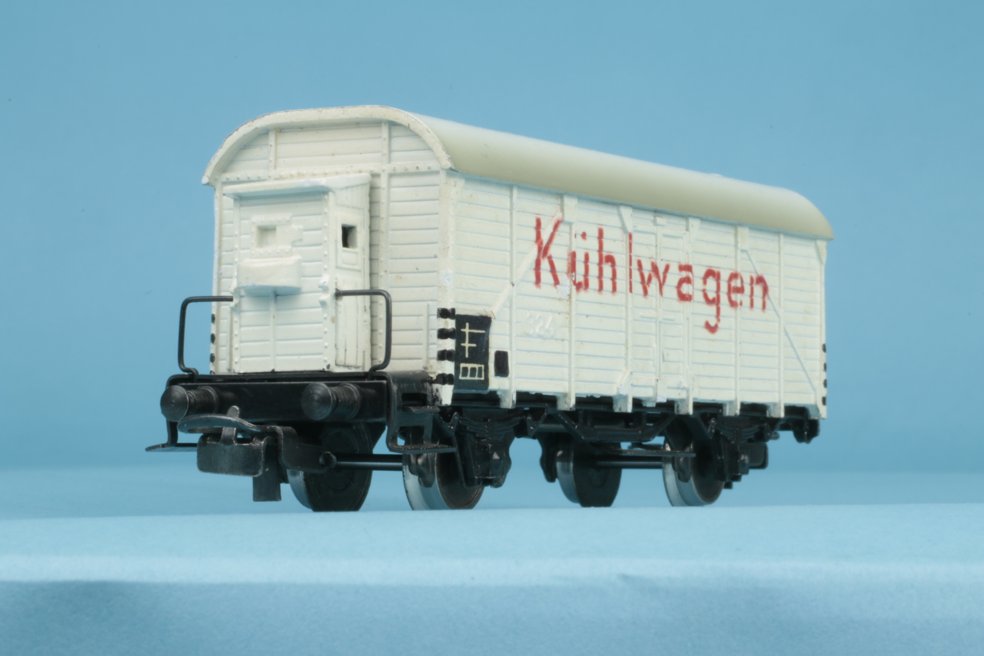 Brakeman´s cab without brake spindle. Wheelsets with brake shoes. Small bow couplings (type 5). Roof repainted by us. Otherwise good original condition.