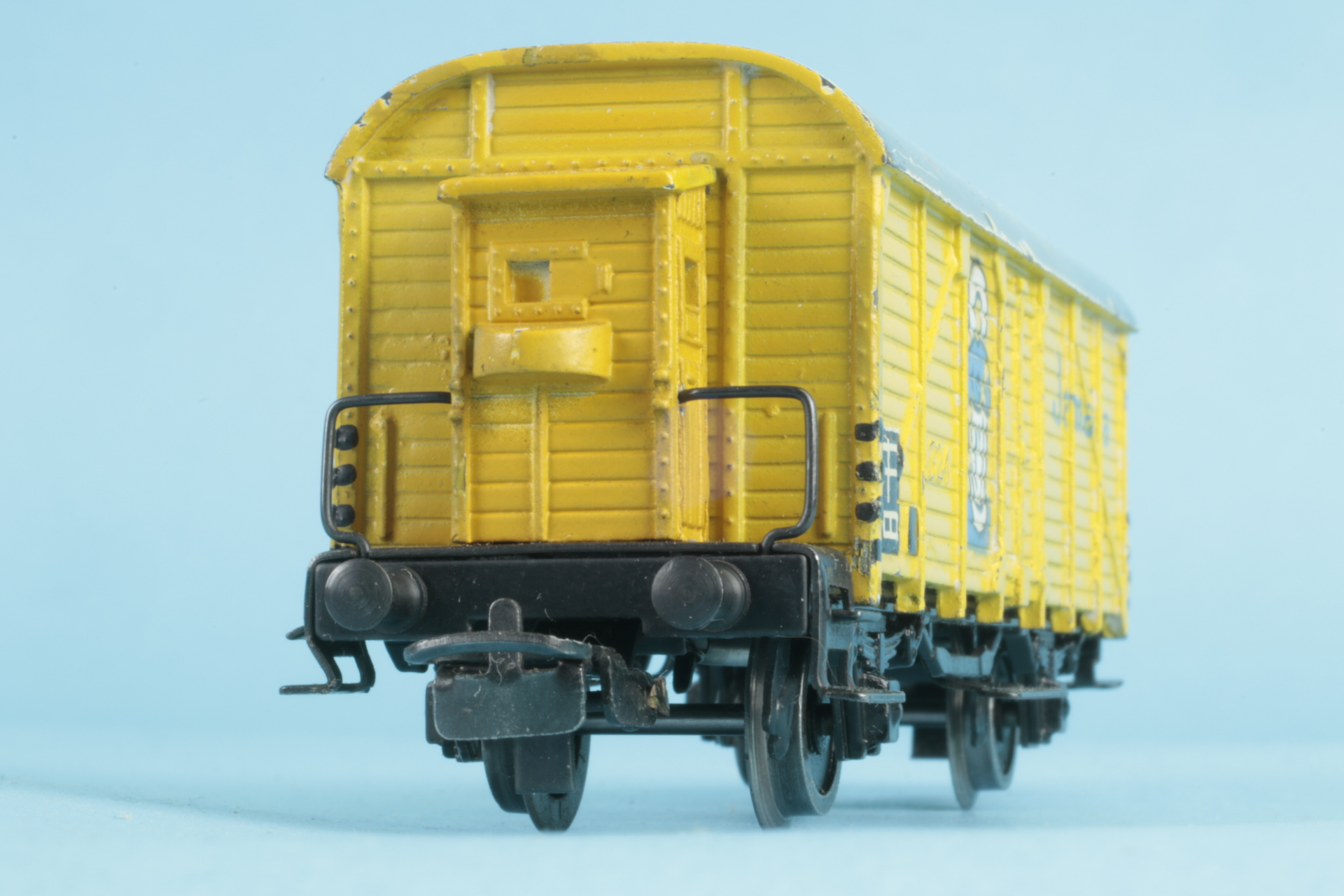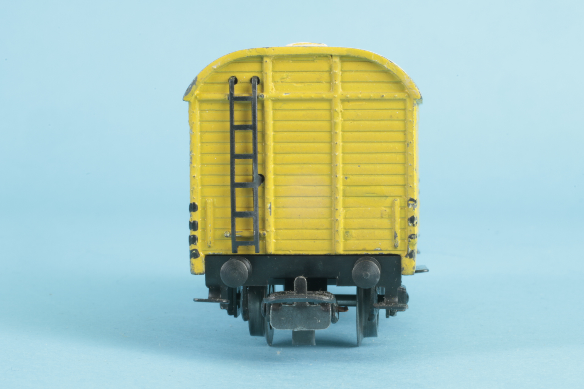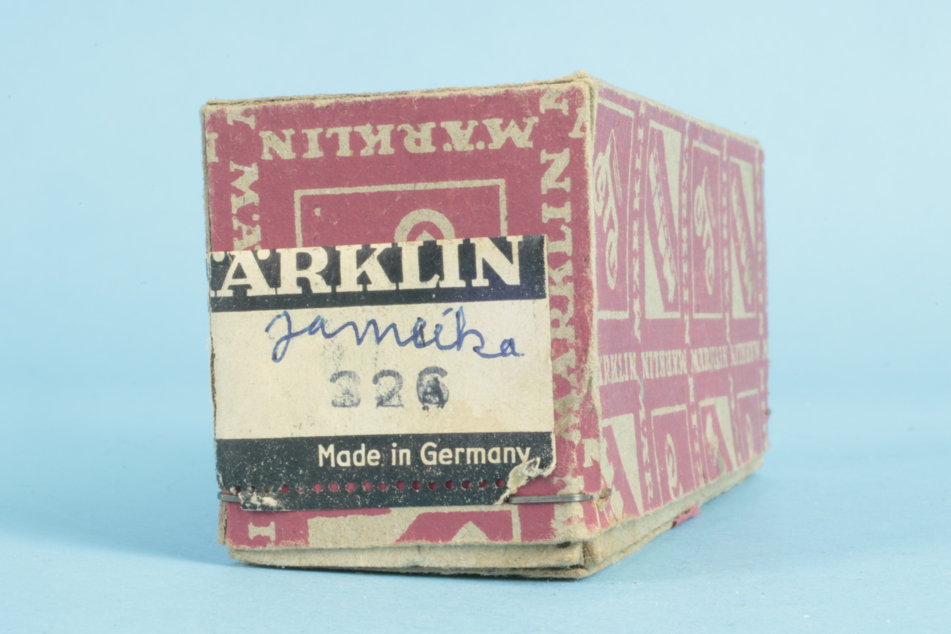 Brakeman´s cab with screw. Wheelsets with brake shoes. Built appr. 1952. Some damages to the color all around, partially repaired. In the original box.