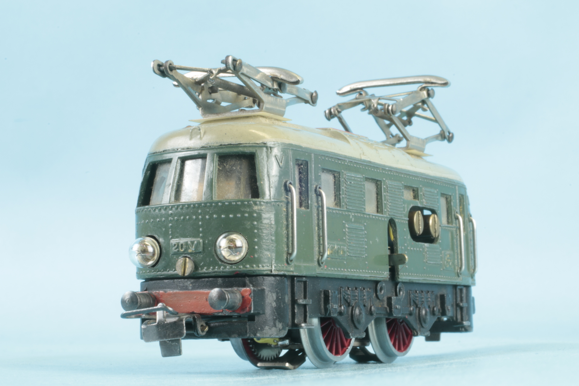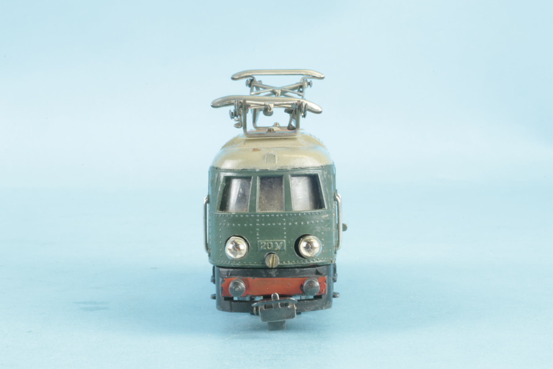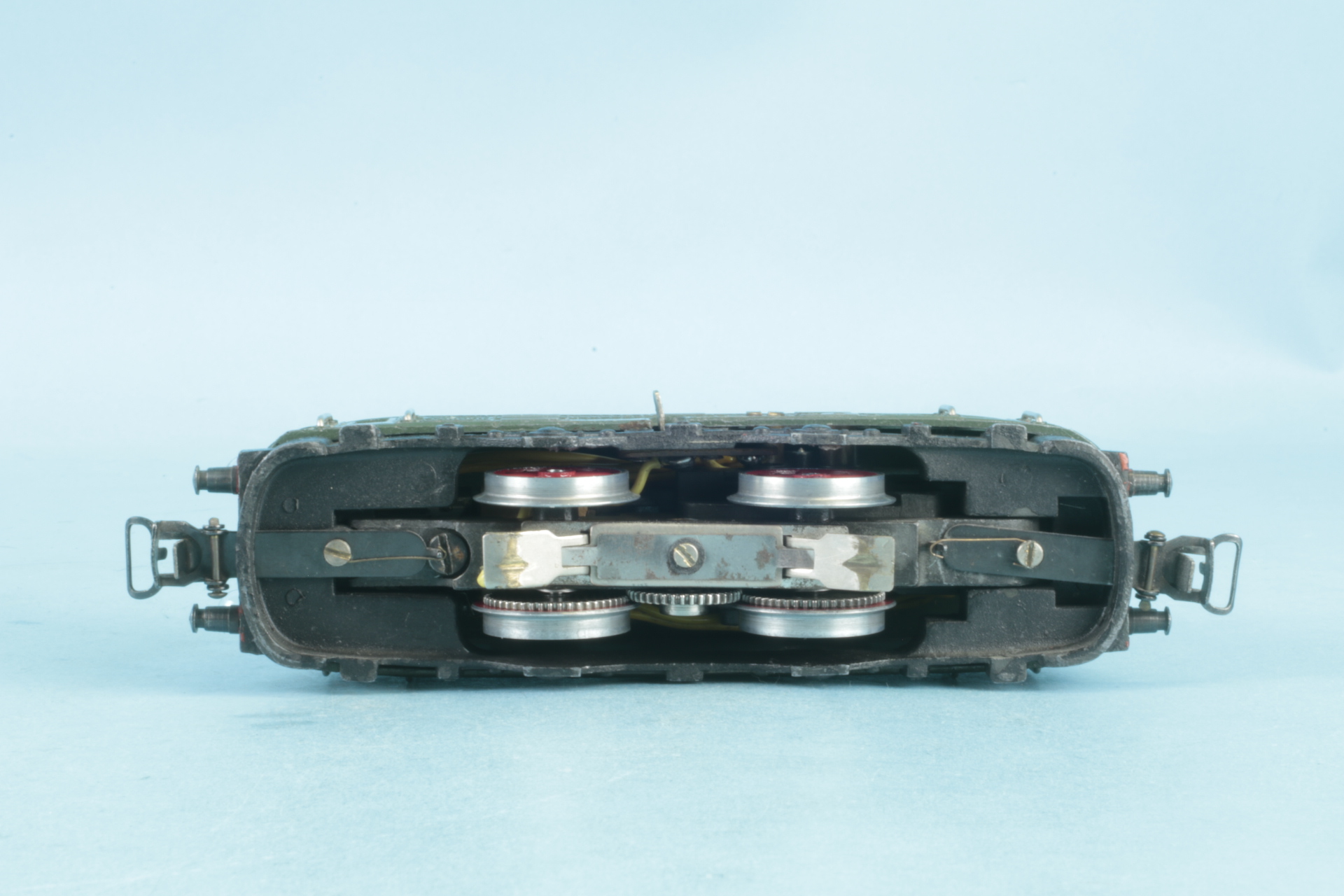 Connection between the pantographs. Nickled tin plate pantographs with long slider (tpe 2.2). Double spoon slider (replica). Black bow couplings (4.2), black buffers. Some damages to the paint. No cracks or broken parts. The wheels were repalced by us. Otherwise good original condition. Function tested.