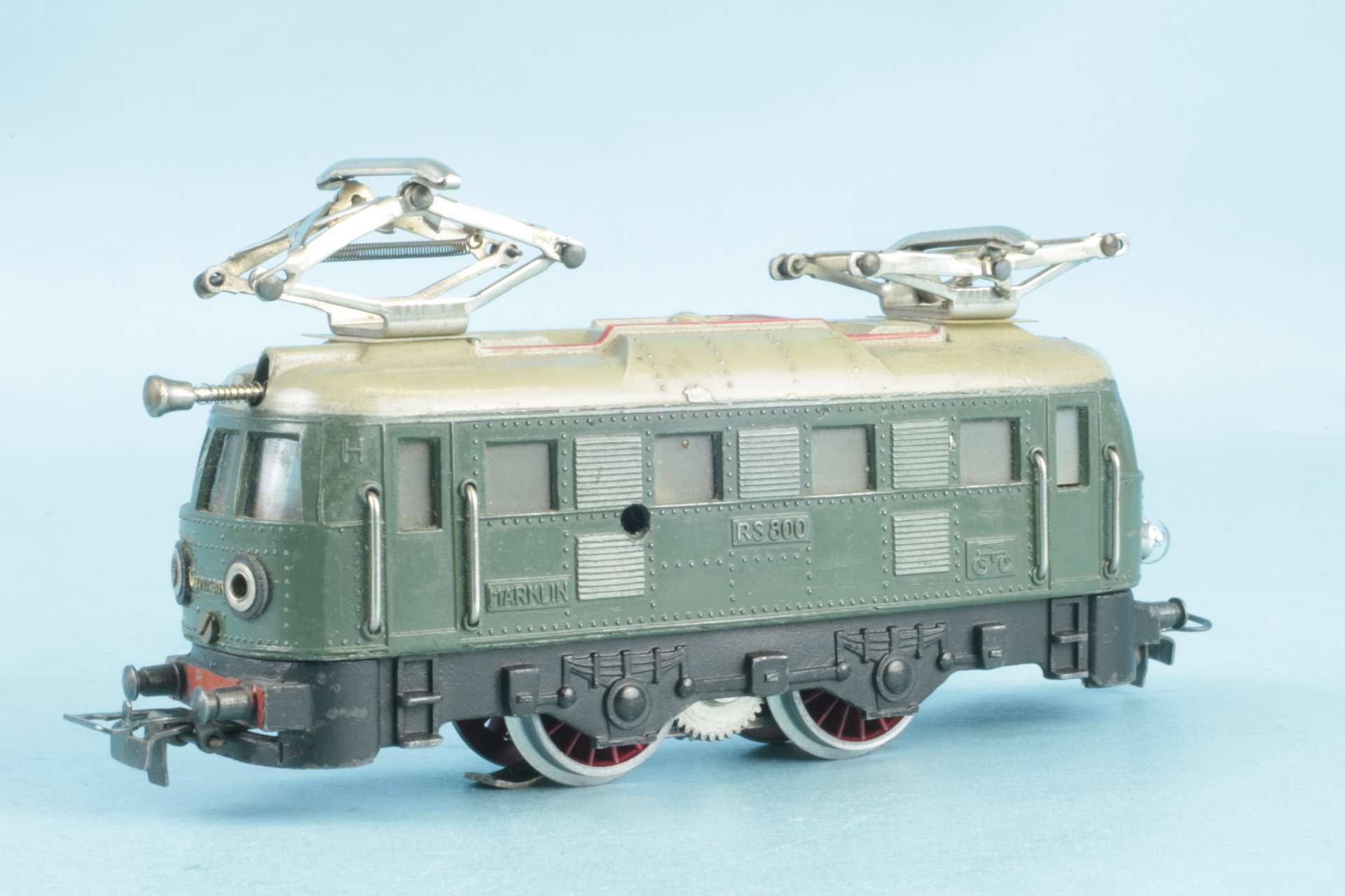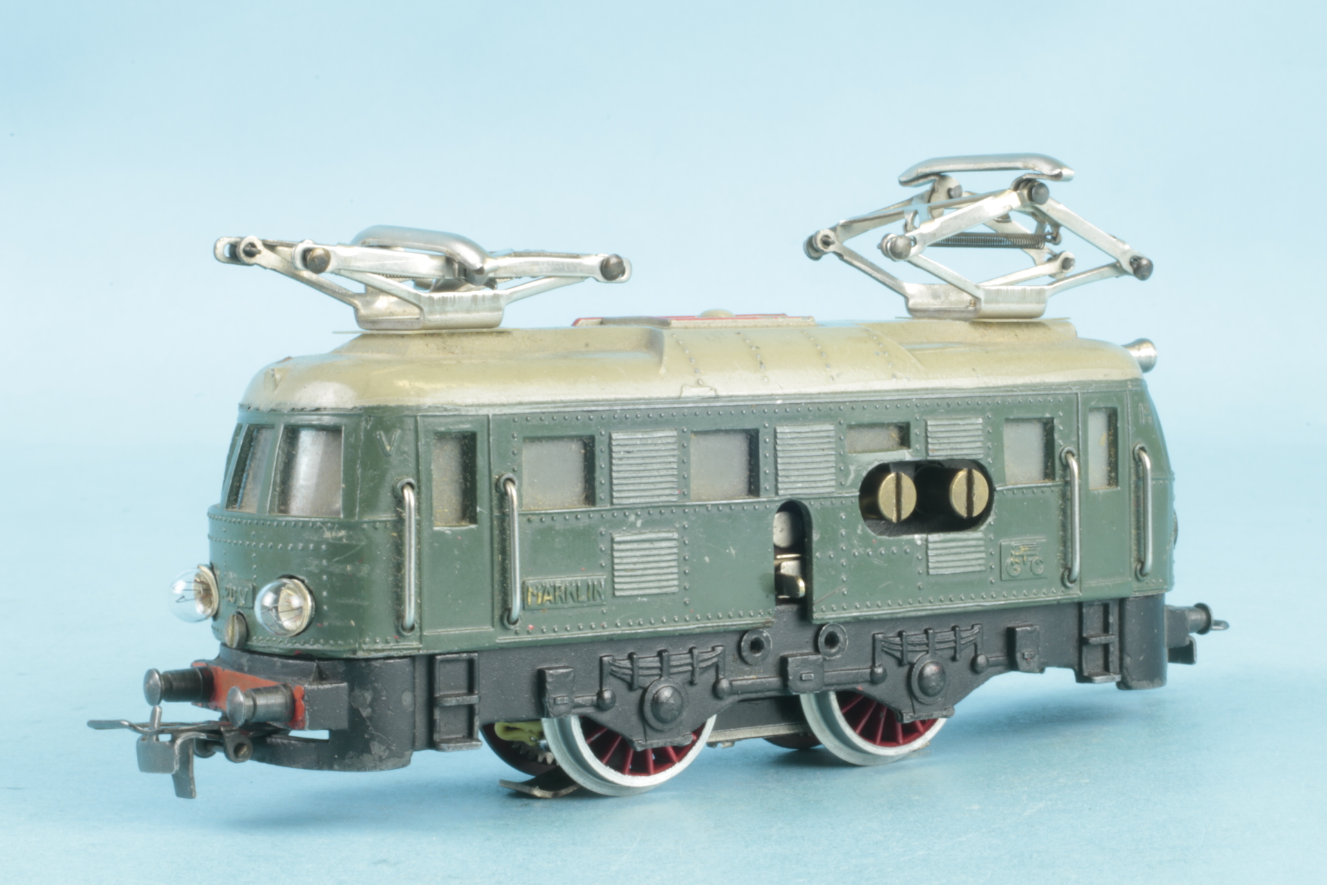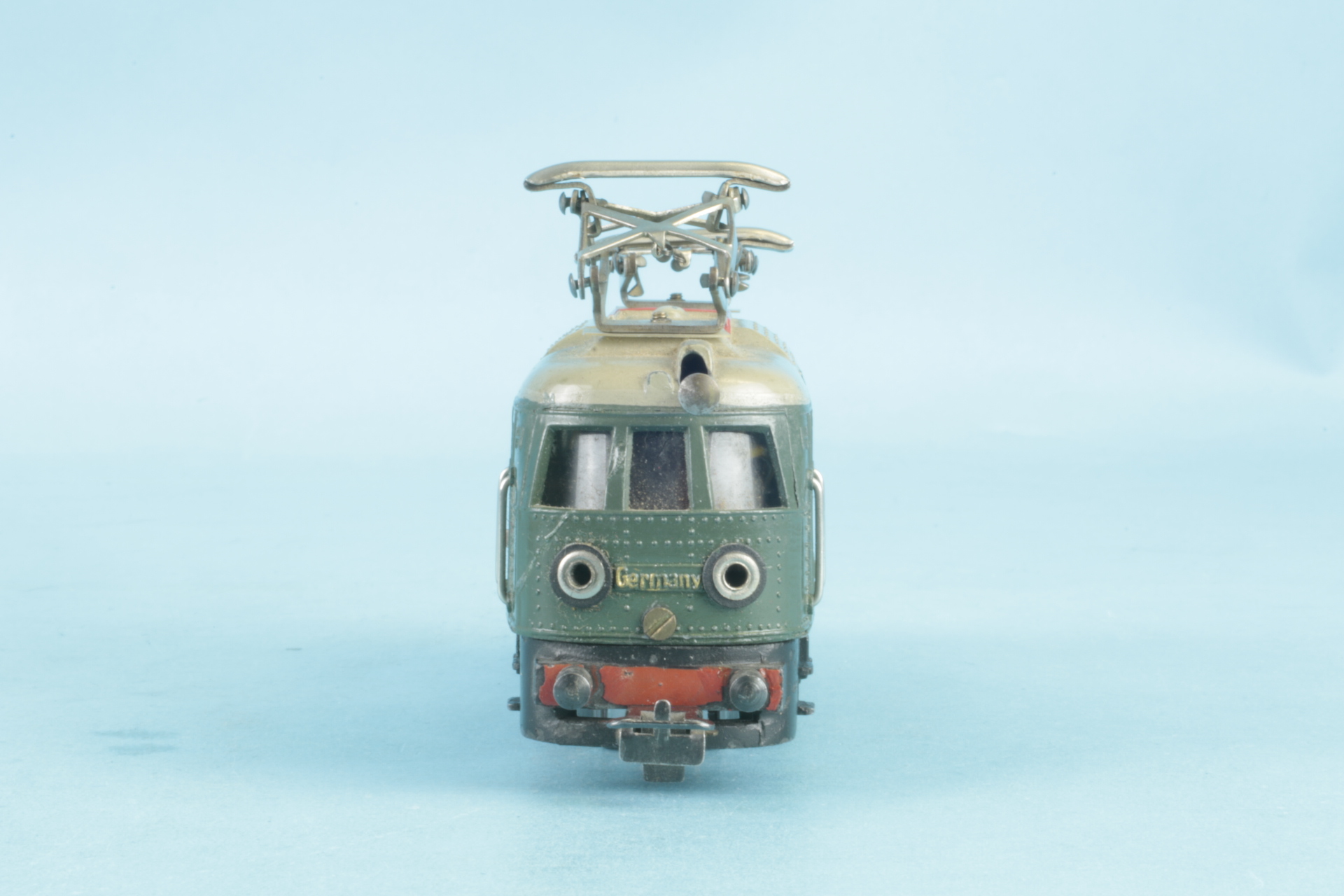 Connection between the pantographs. Nickled tin plate pantographs with long slider (tpe 2.2). Double spoon slider (replica). Black bow couplings (4.2), black buffers. Some damages to the paint. No cracks or broken parts. The wheels were repalced by us. Otherwise good original condition. Function tested.