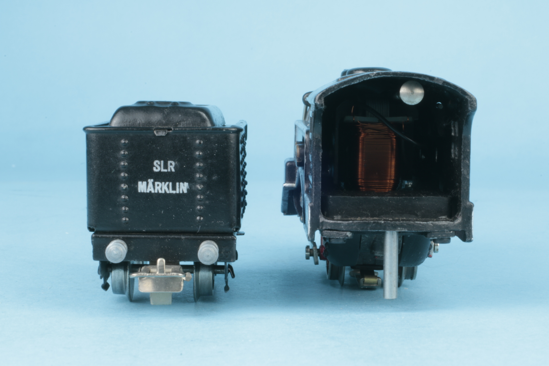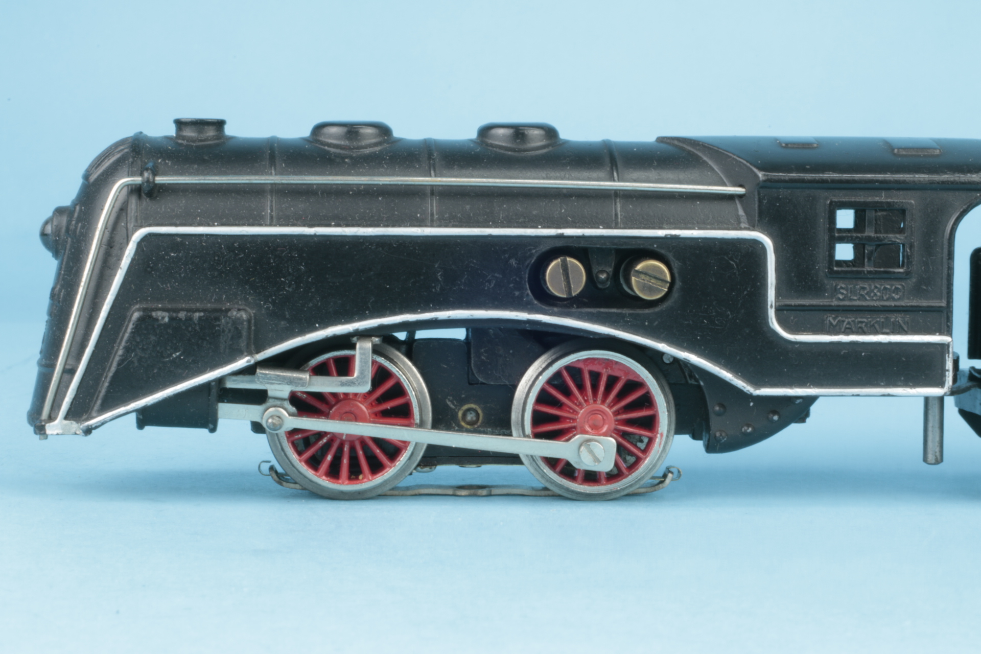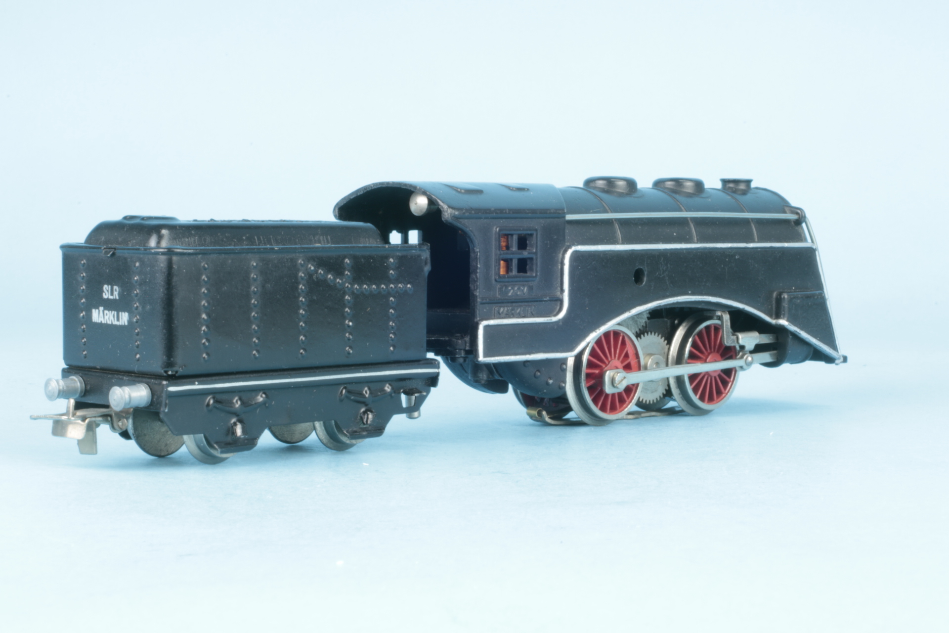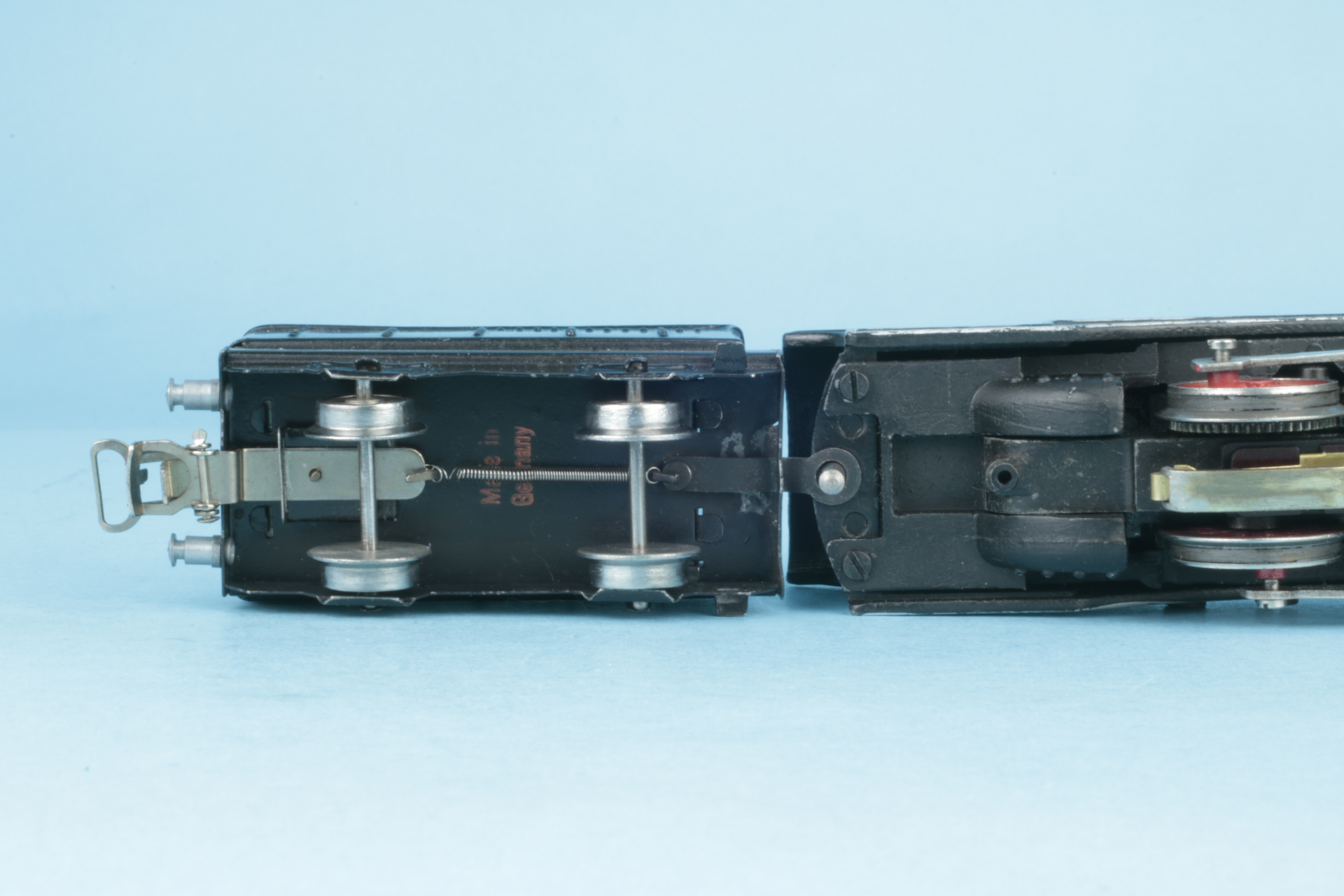 Silver lines, silver stamp on the tender. Skislider with large hole. Traction tyres on the rear wheel set. Tender with nickled bow coupling (4.1). Built around 1938. Some signs of usage. Silver lines on the locomotive partially repainted by us. Minor damage to the sheet metal on the tender in the area of the front coupling. Overall in good condition. No cracks in the cast parts. Function tested.