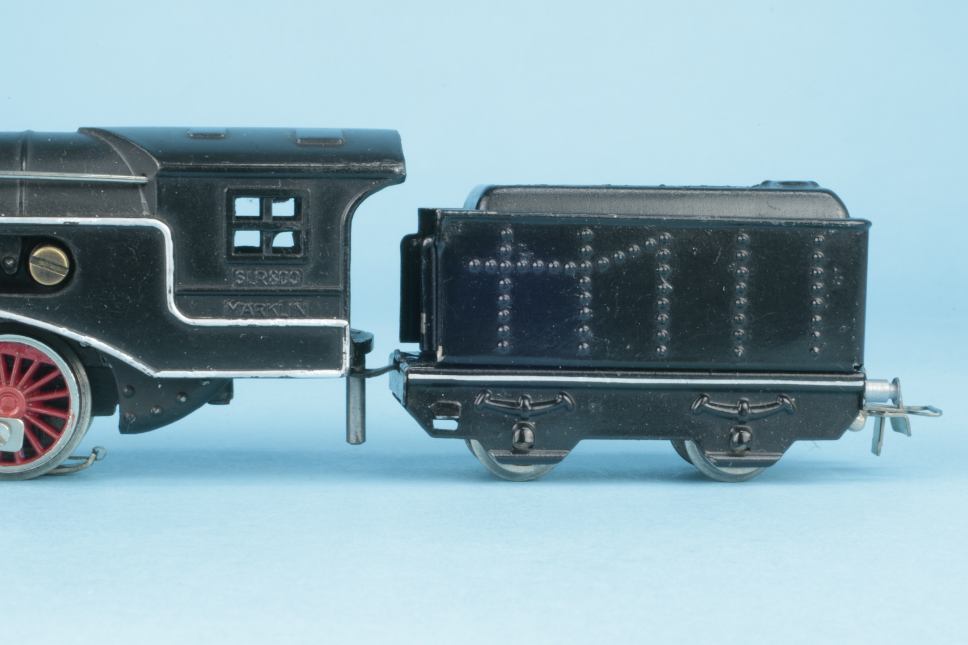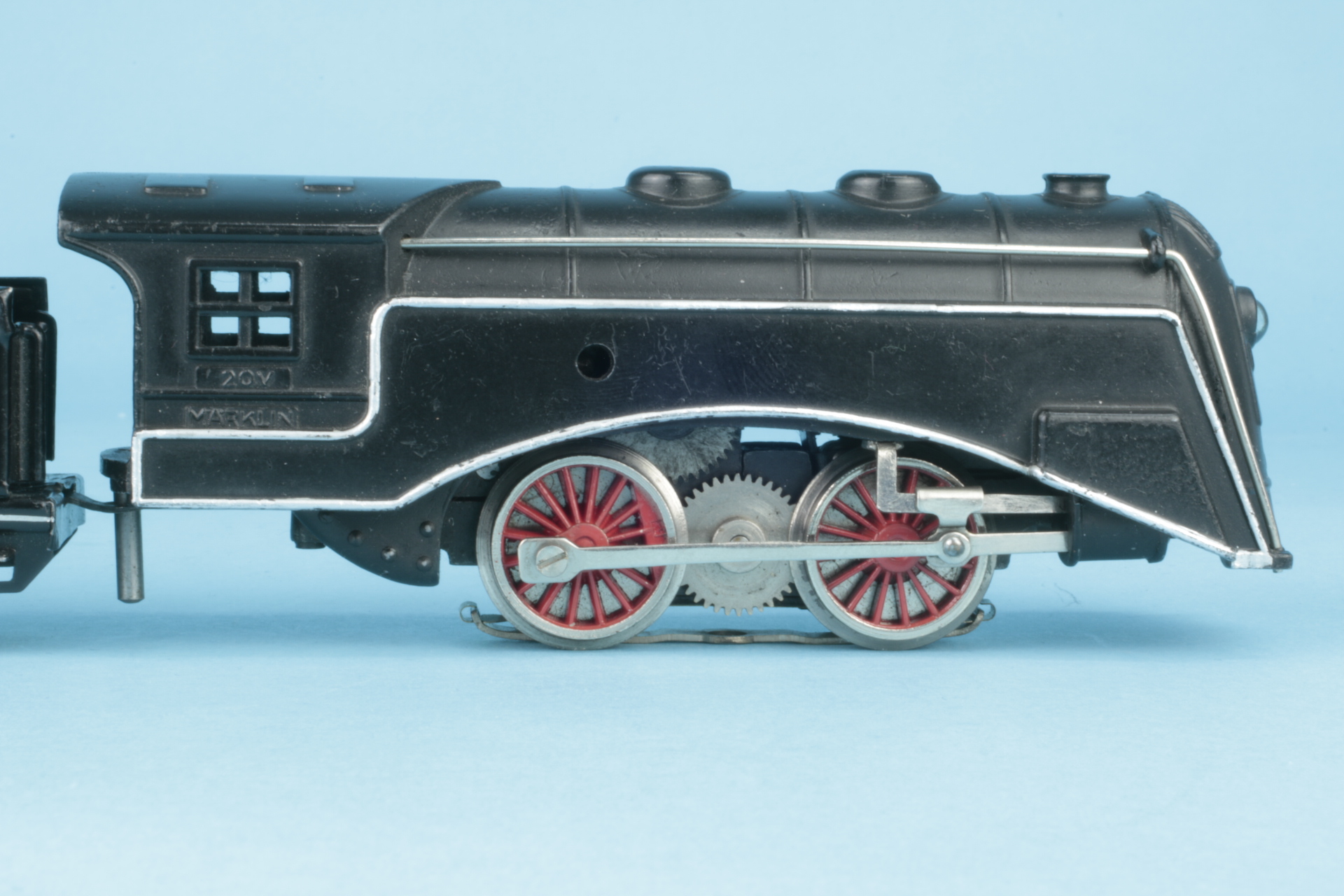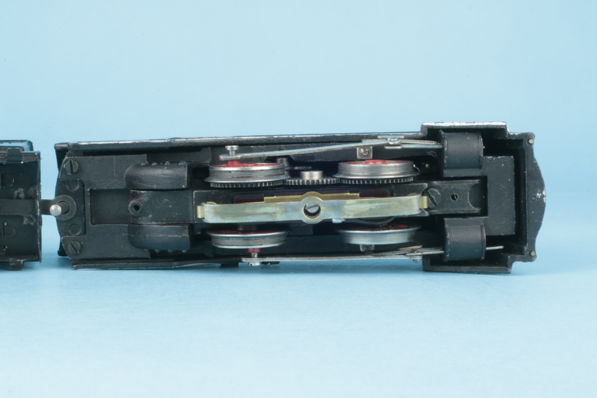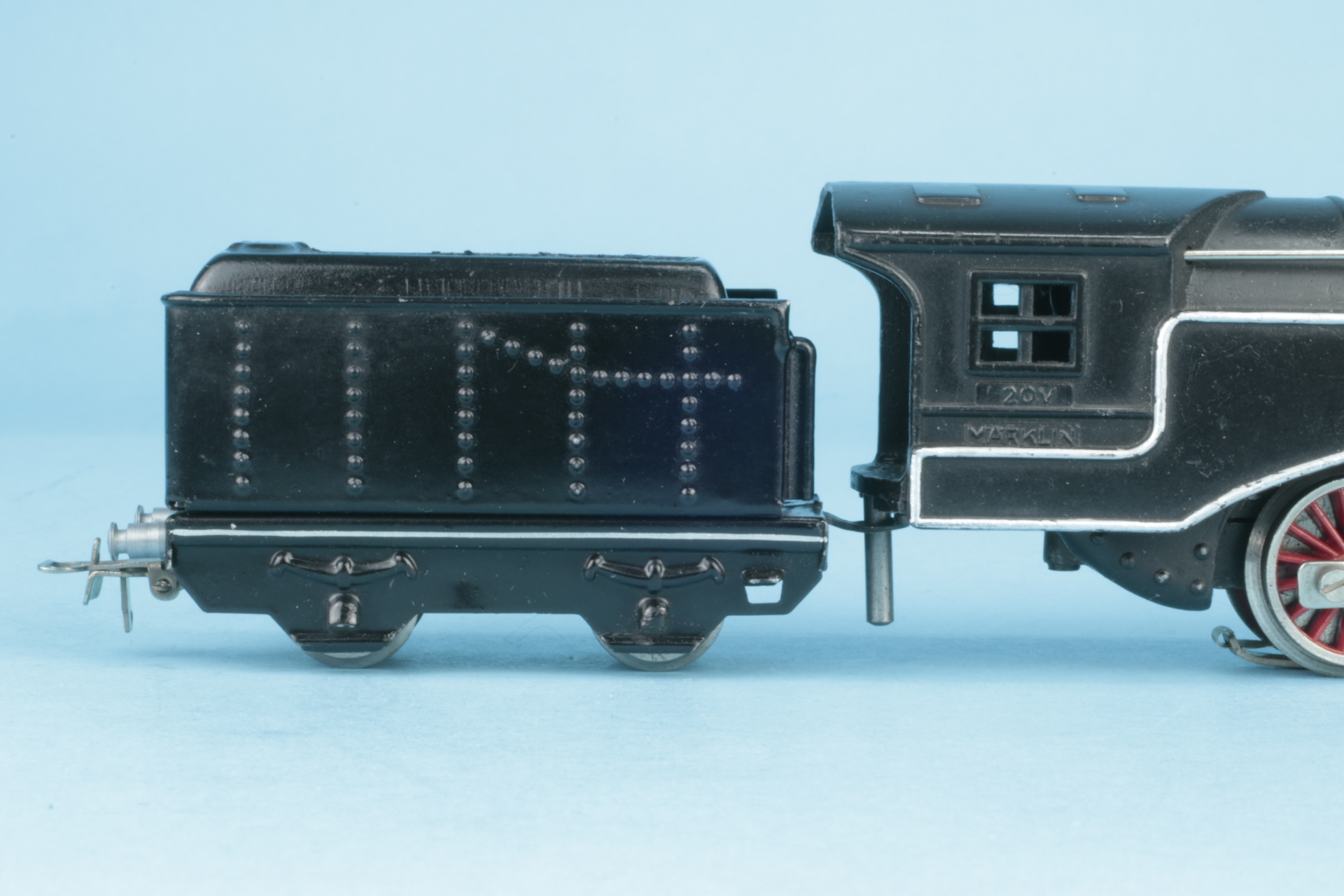 Silver lines, silver stamp on the tender. Skislider with large hole. Traction tyres on the rear wheel set. Tender with nickled bow coupling (4.1). Built around 1938. Some signs of usage. Silver lines on the locomotive partially repainted by us. Minor damage to the sheet metal on the tender in the area of the front coupling. Overall in good condition. No cracks in the cast parts. Function tested.