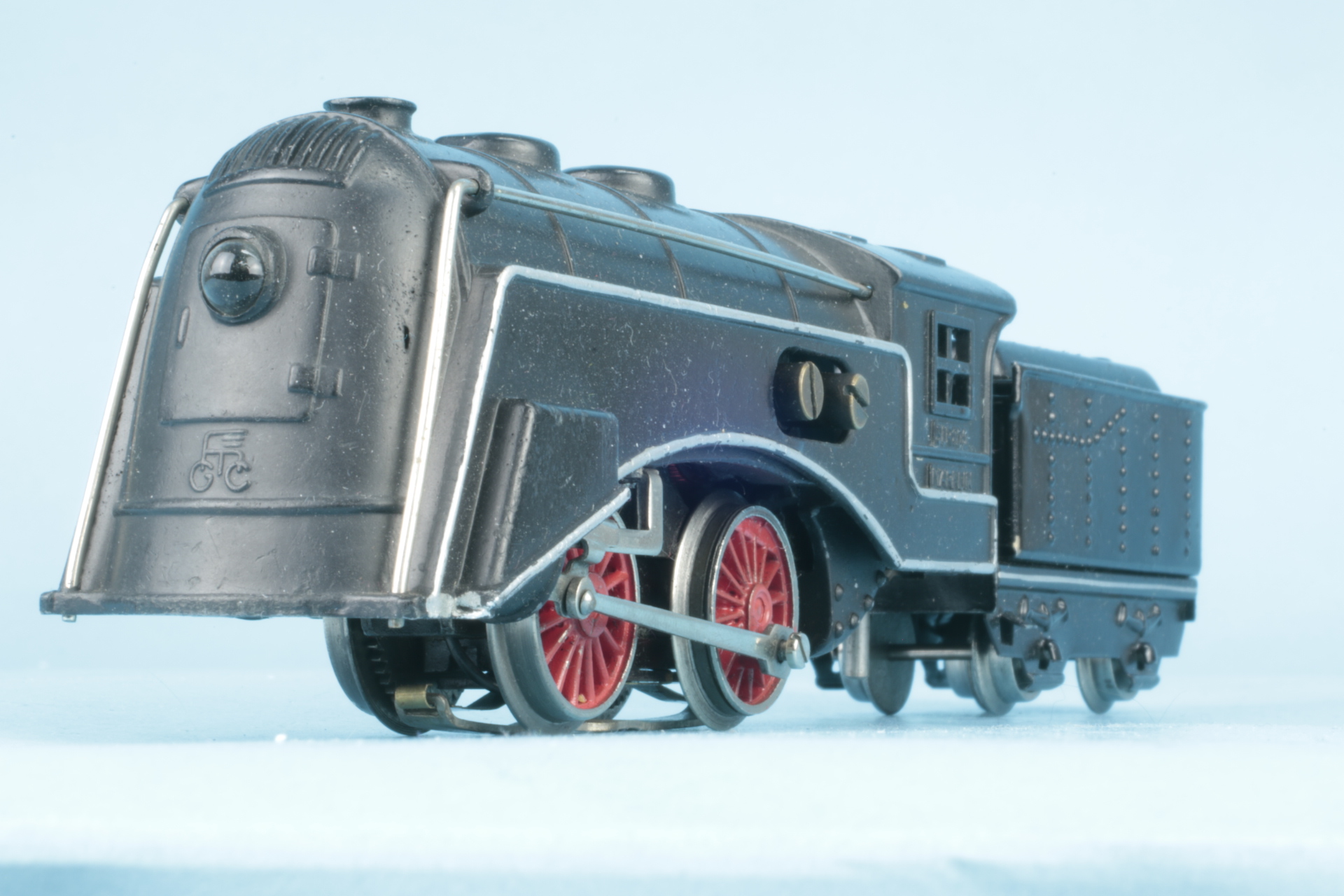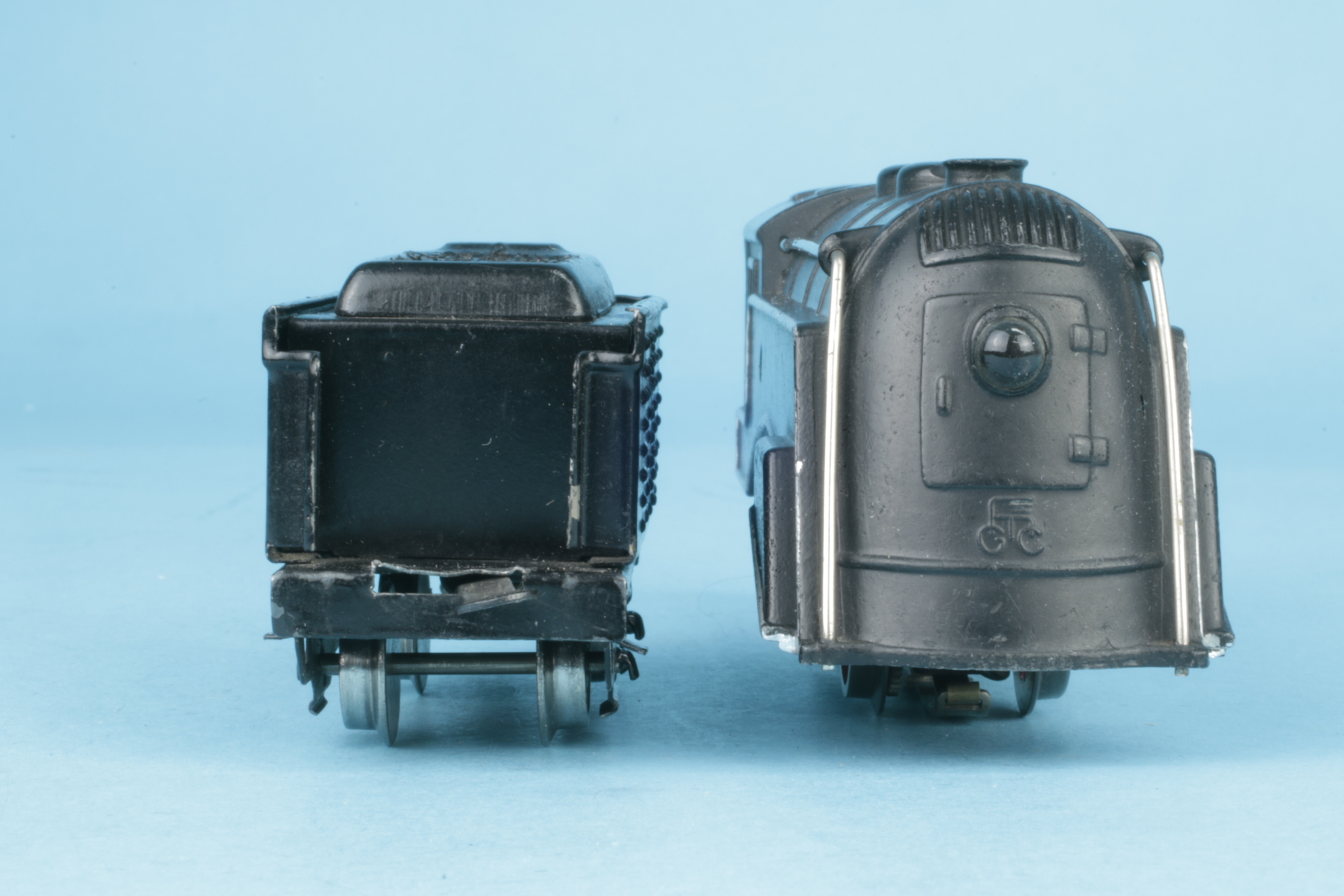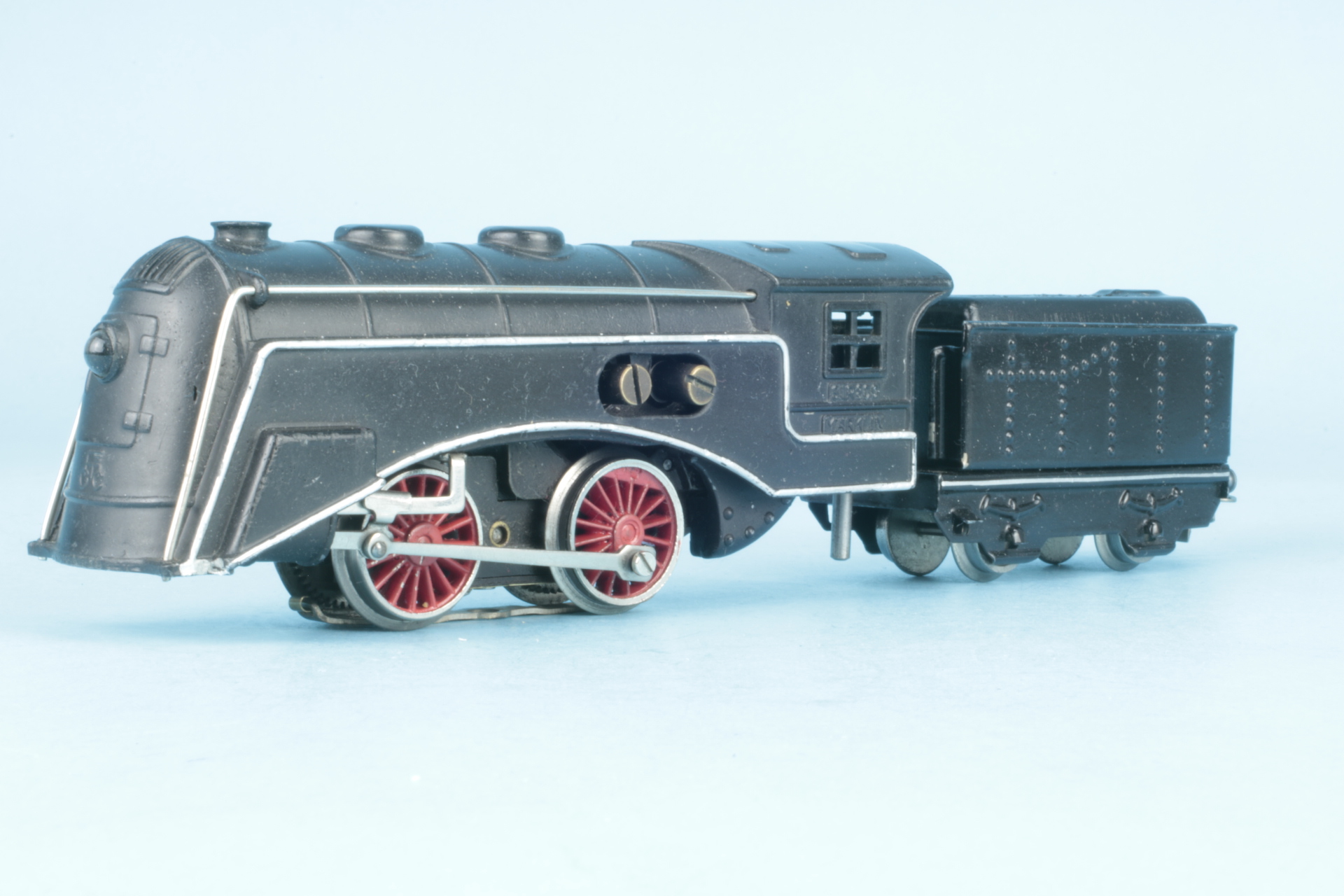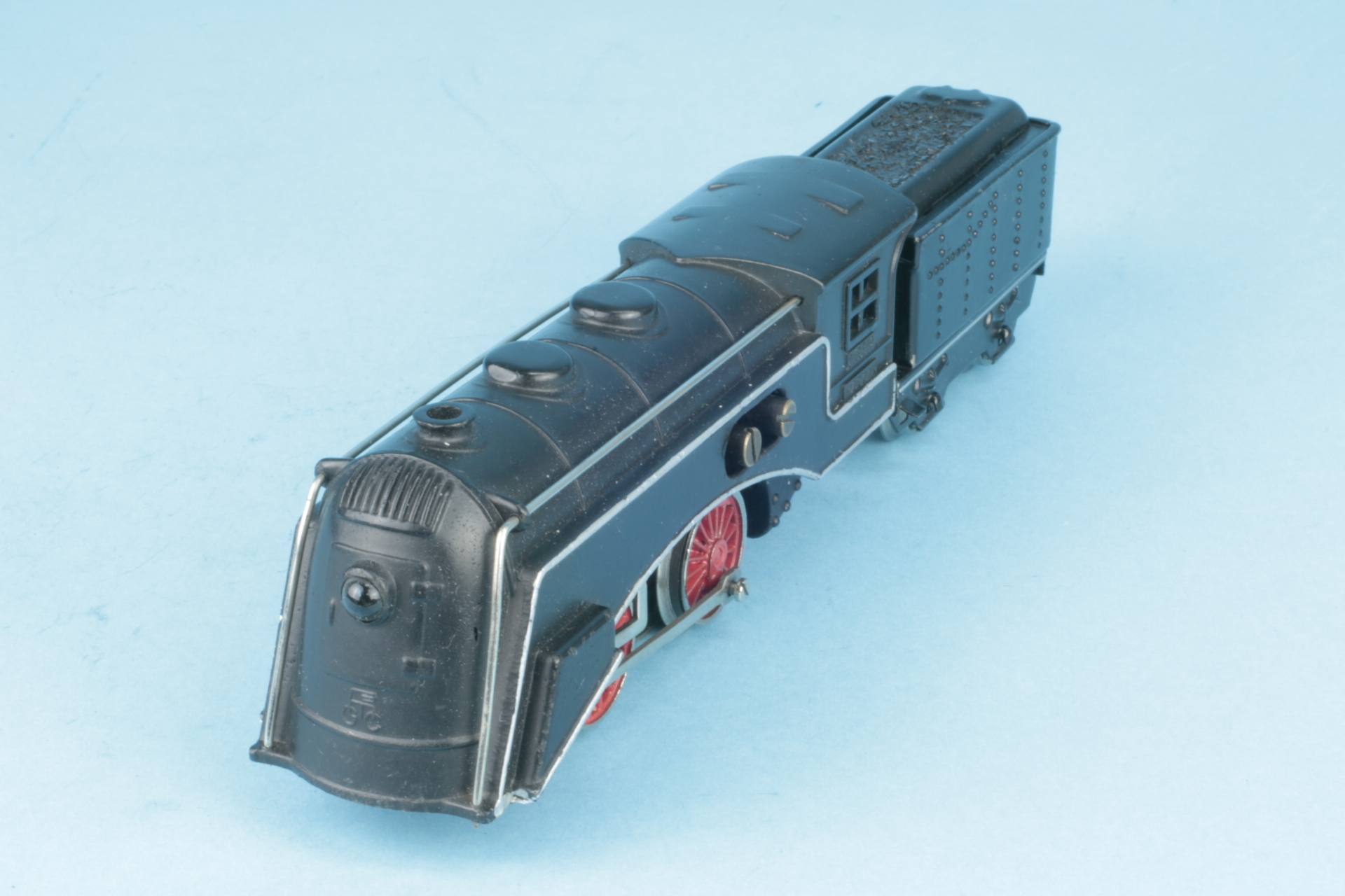 Silver lines, silver stamp on the tender. Skislider with large hole. Traction tyres on the rear wheel set. Tender with nickled bow coupling (4.1). Built around 1938. Some signs of usage. Silver lines on the locomotive partially repainted by us. Minor damage to the sheet metal on the tender in the area of the front coupling. Overall in good condition. No cracks in the cast parts. Function tested.