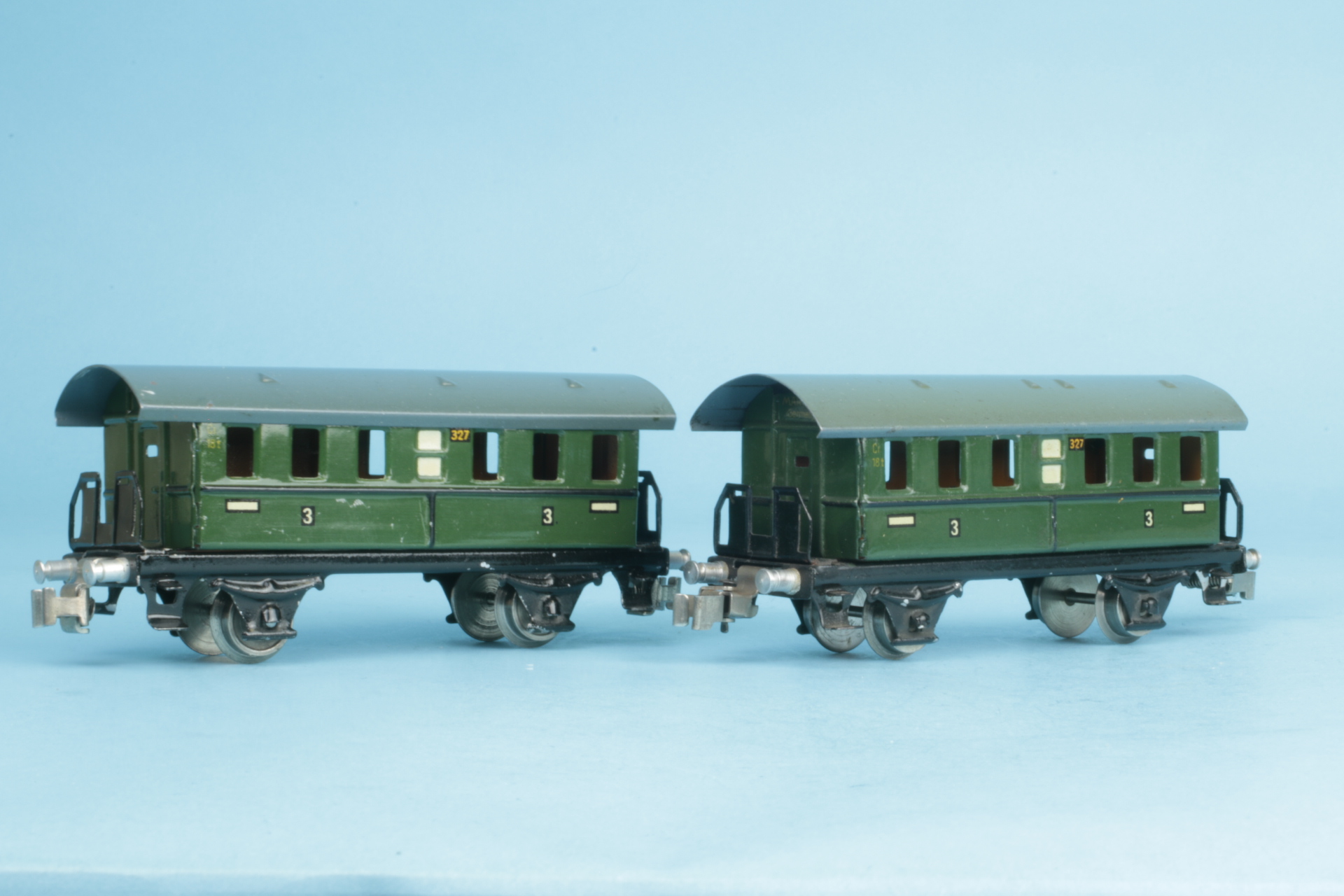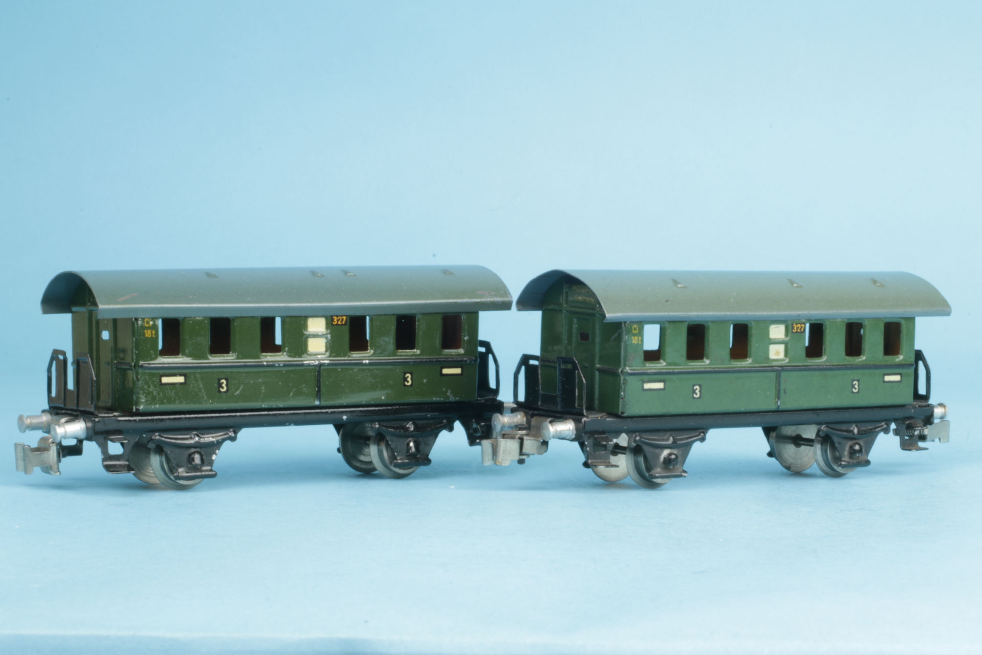 Vernickelte Radsätze und vernickelte Klauenkupplungen. Bauzeit etwa 1938. Kleinere Farbschäden. Insgesamt guter Originalzustand. In den Originalkartons.