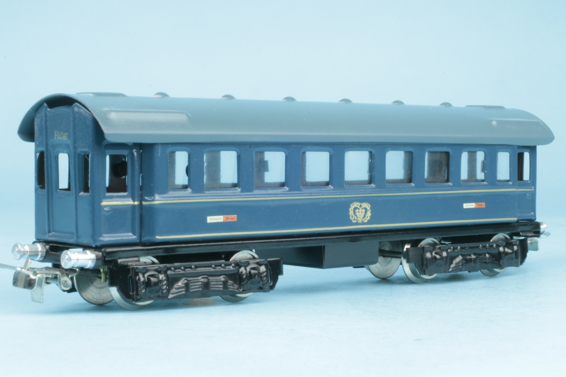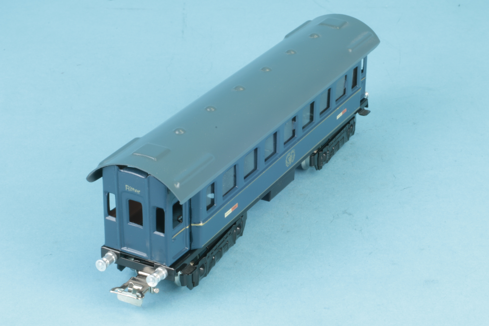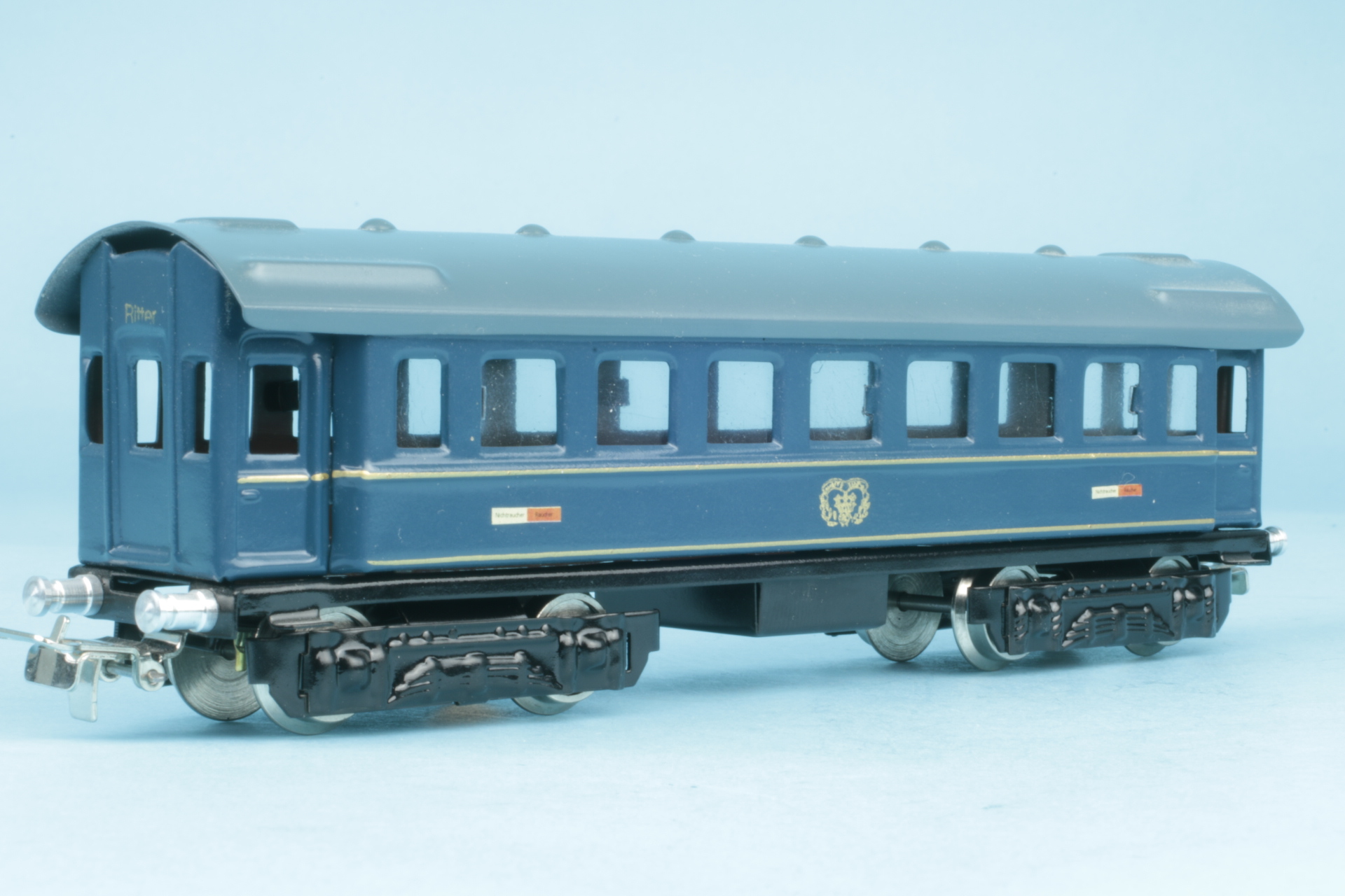 Blechdrehgestelle mit vernickelten Bügelkupplungen. Drehgestelle, Cellonscheiben, Puffer sind Replika aus unserer Produktion. Der Wagen wurde in dieser Farbgebung von Märklin nicht angeboten. Der Wagen wurde in unserem Haus passend zu den Wagen 342J bis 344J lackiert.