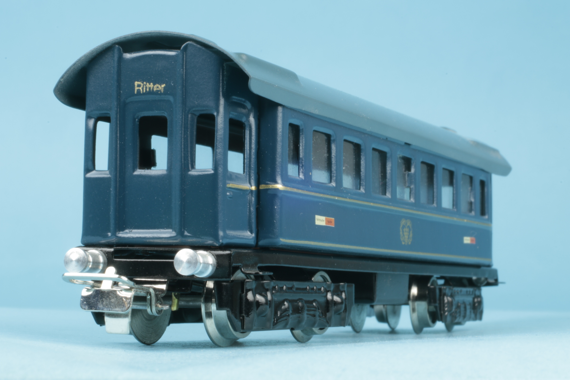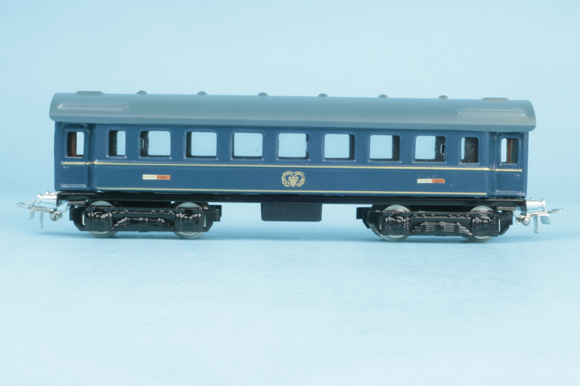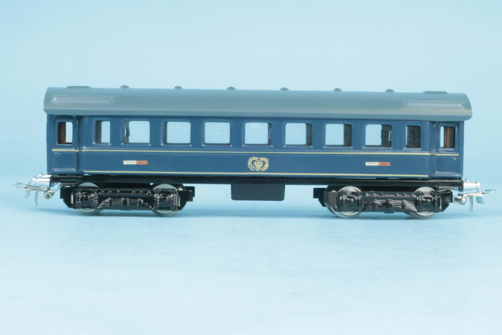 Blechdrehgestelle mit vernickelten Bügelkupplungen. Drehgestelle, Cellonscheiben, Puffer sind Replika aus unserer Produktion. Der Wagen wurde in dieser Farbgebung von Märklin nicht angeboten. Der Wagen wurde in unserem Haus passend zu den Wagen 342J bis 344J lackiert.