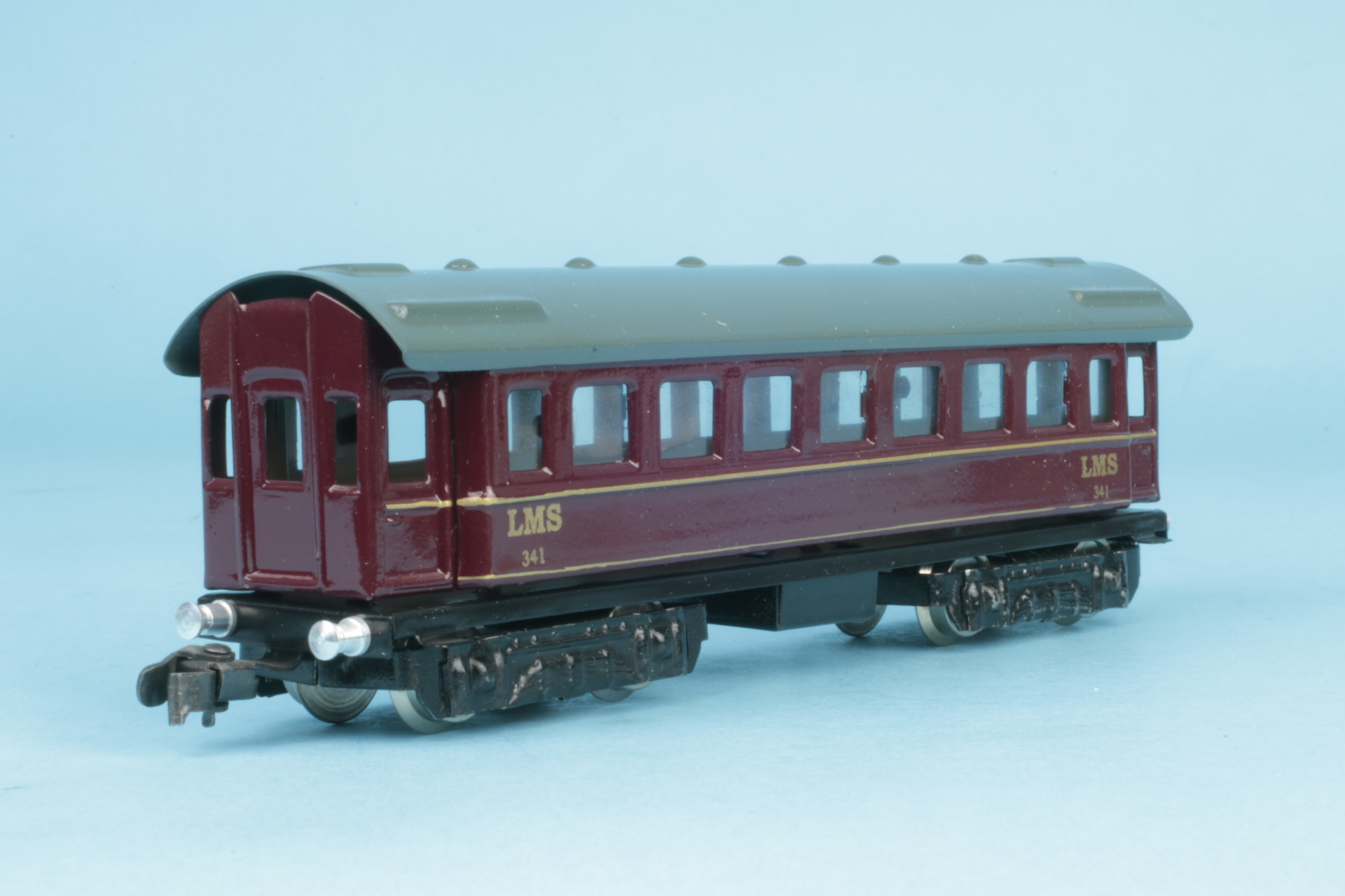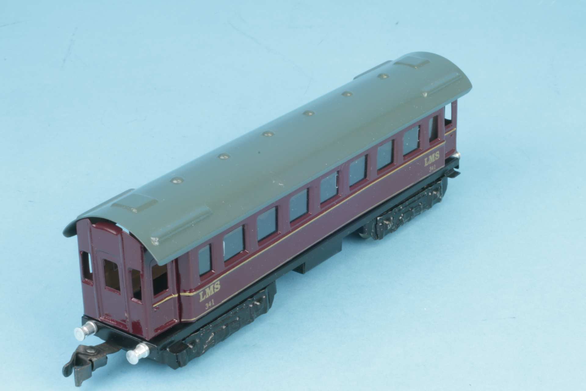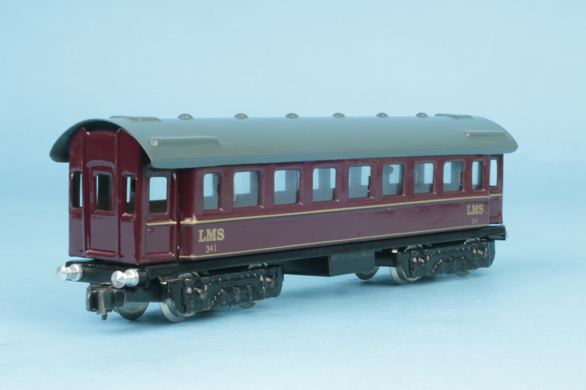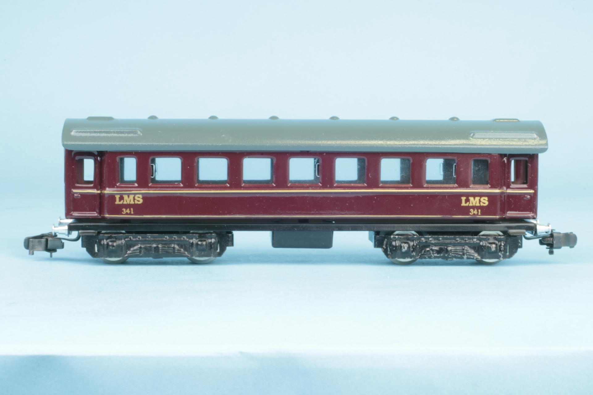 341 LMS, braun. Vierachsiger Personenwagen mit LMS Beschriftung. Länge ca. 17,5 cm.