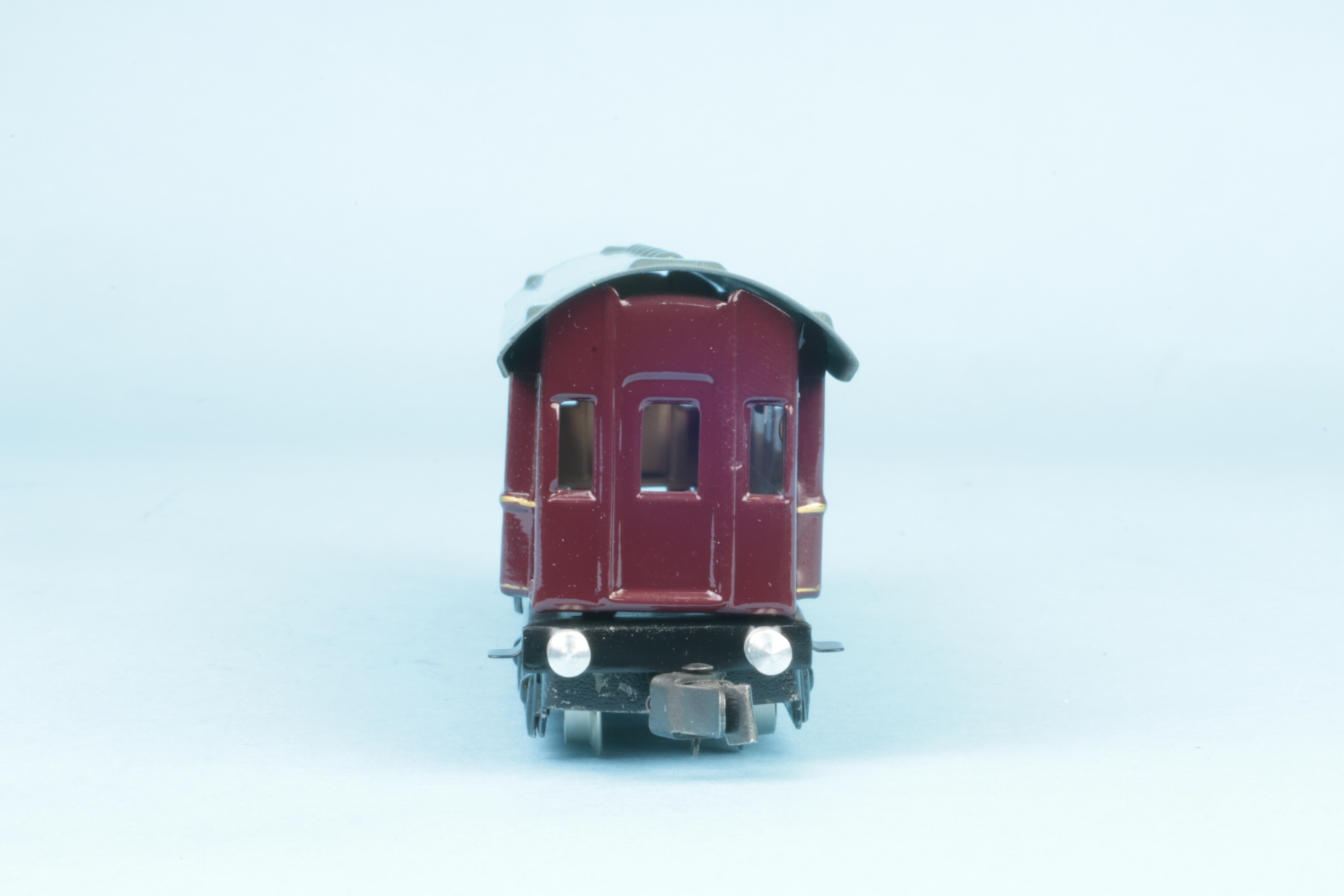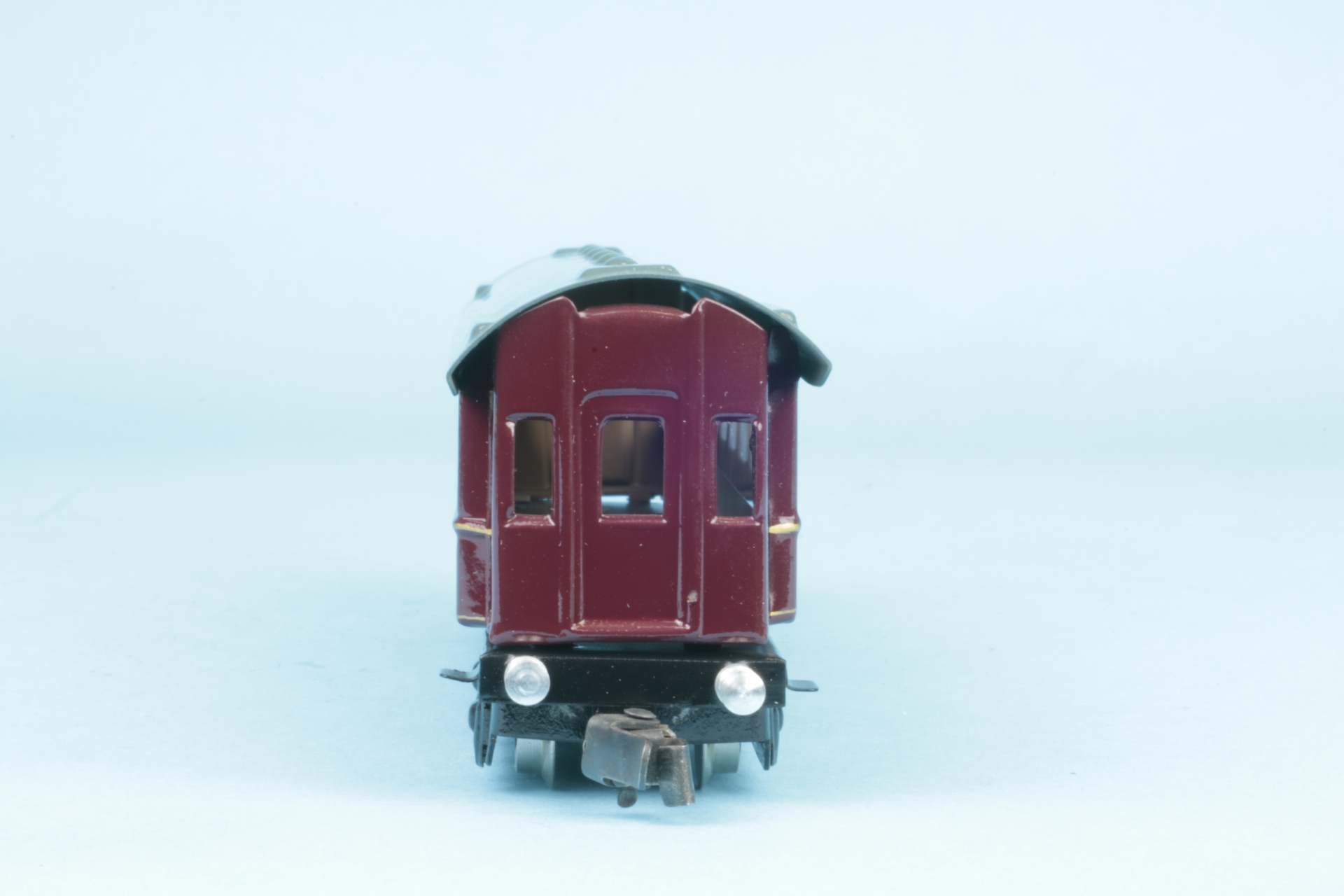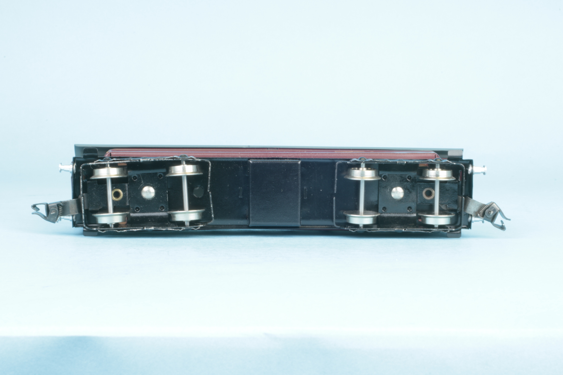 Blechdrehgestelle mit brünierter Klauenkupplung. Bauzeit etwa 1936. Der Wagen wurde bei uns restauriert und in englischer Farbgebung neu lackiert. Sehr guter Zustand.