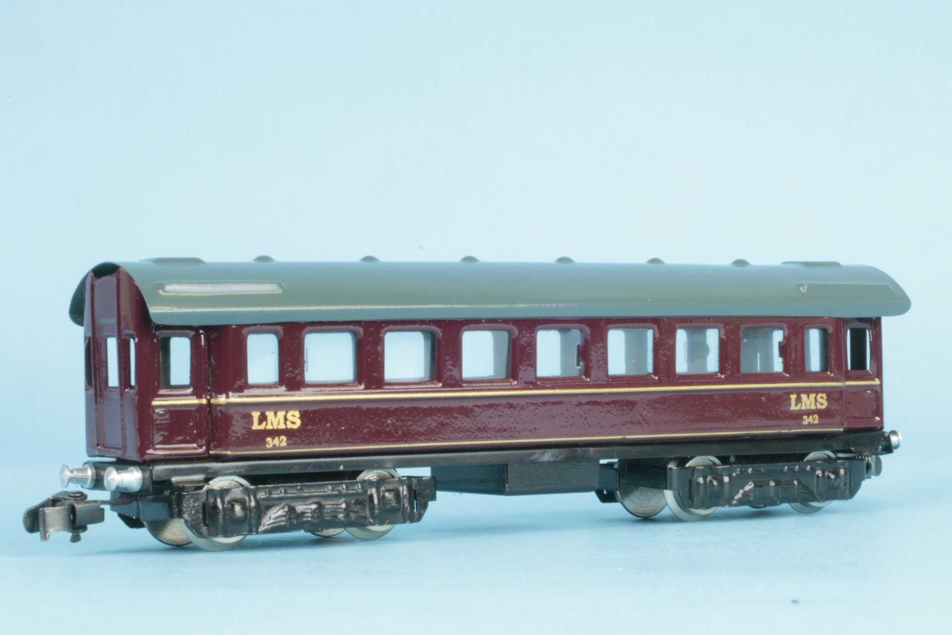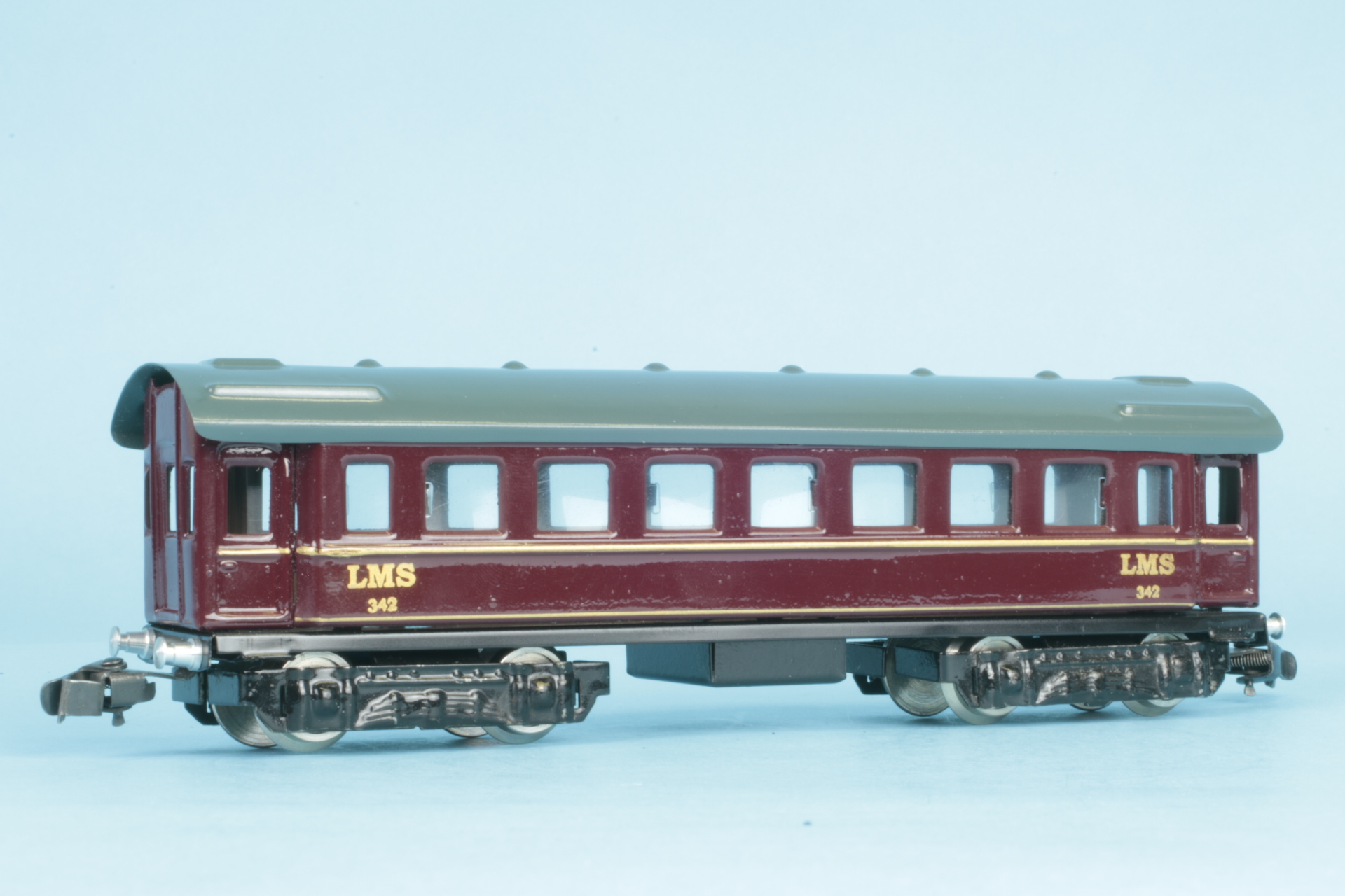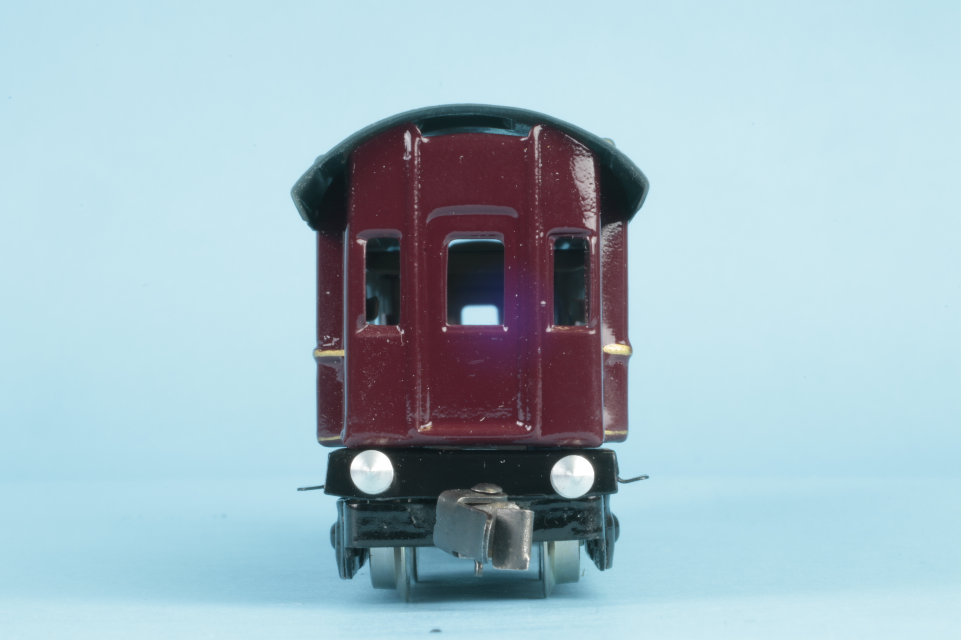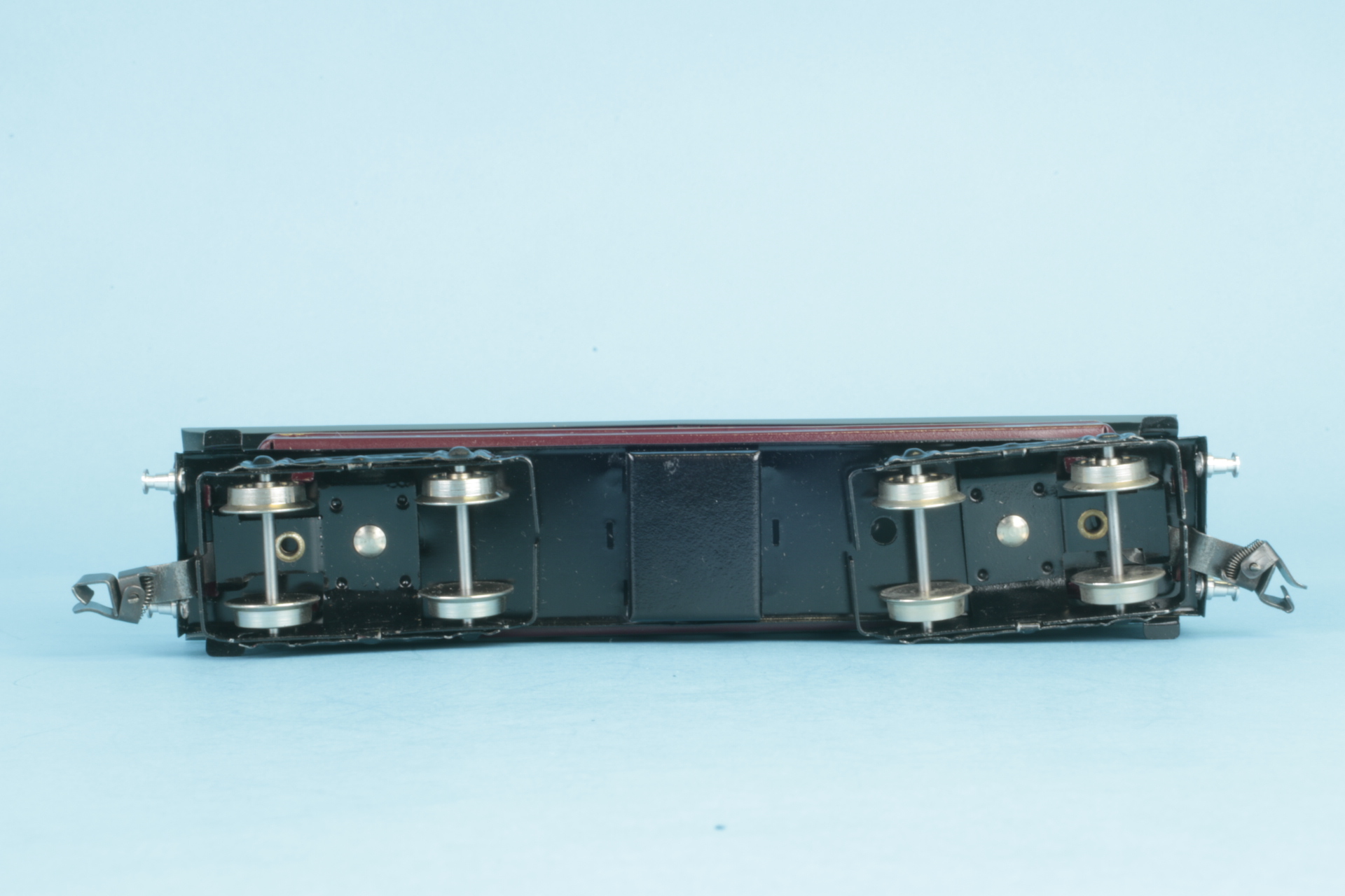 Blechdrehgestelle mit brünierter Klauenkupplung. Bauzeit etwa 1936. Der Wagen wurde bei uns restauriert und in englischer Farbgebung neu lackiert. Sehr guter Zustand.