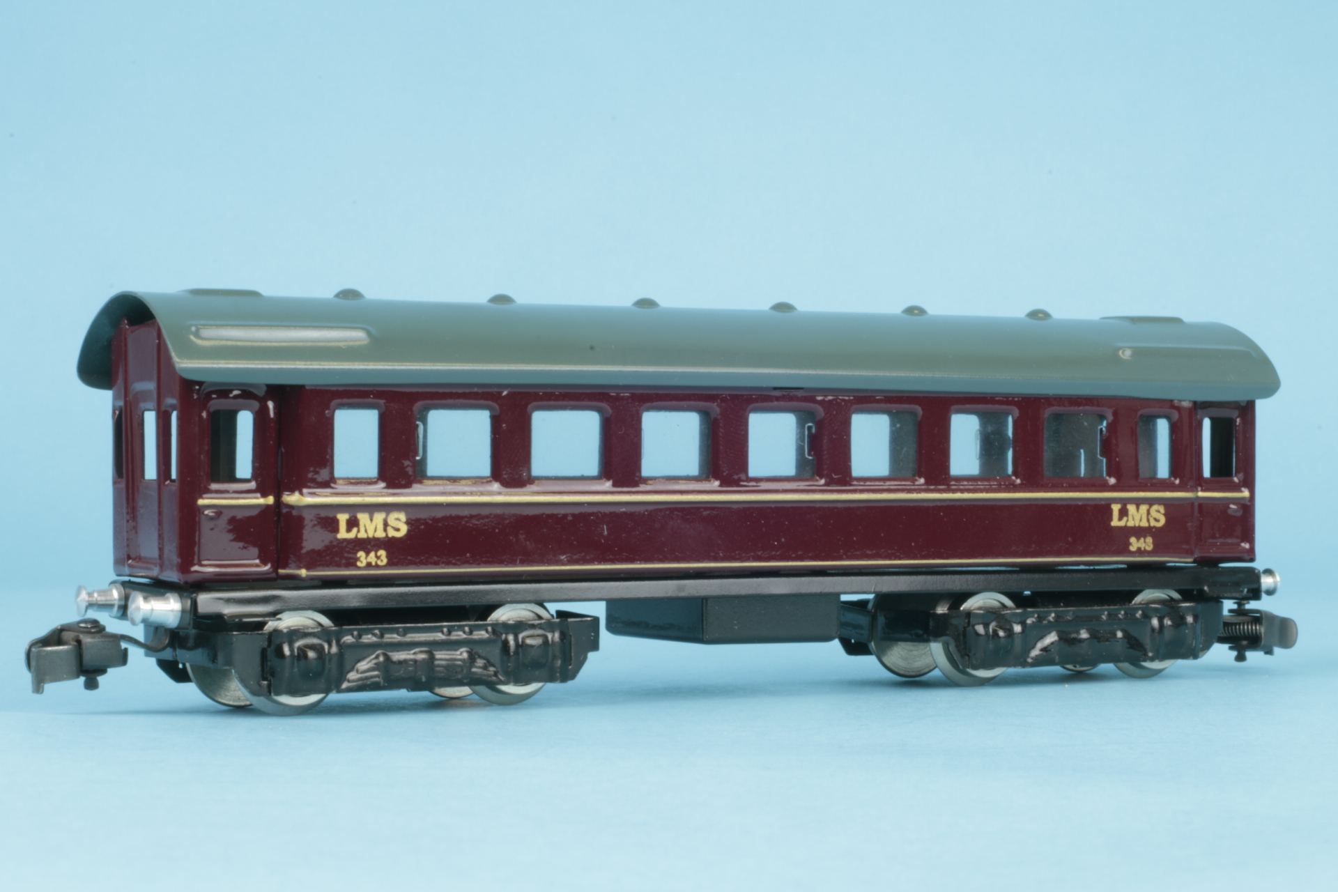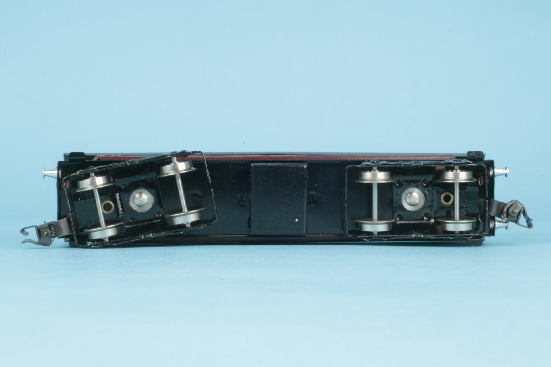 Blechdrehgestelle mit brünierter Klauenkupplung. Bauzeit etwa 1936. Der Wagen wurde bei uns restauriert und in englischer Farbgebung neu lackiert. Sehr guter Zustand.