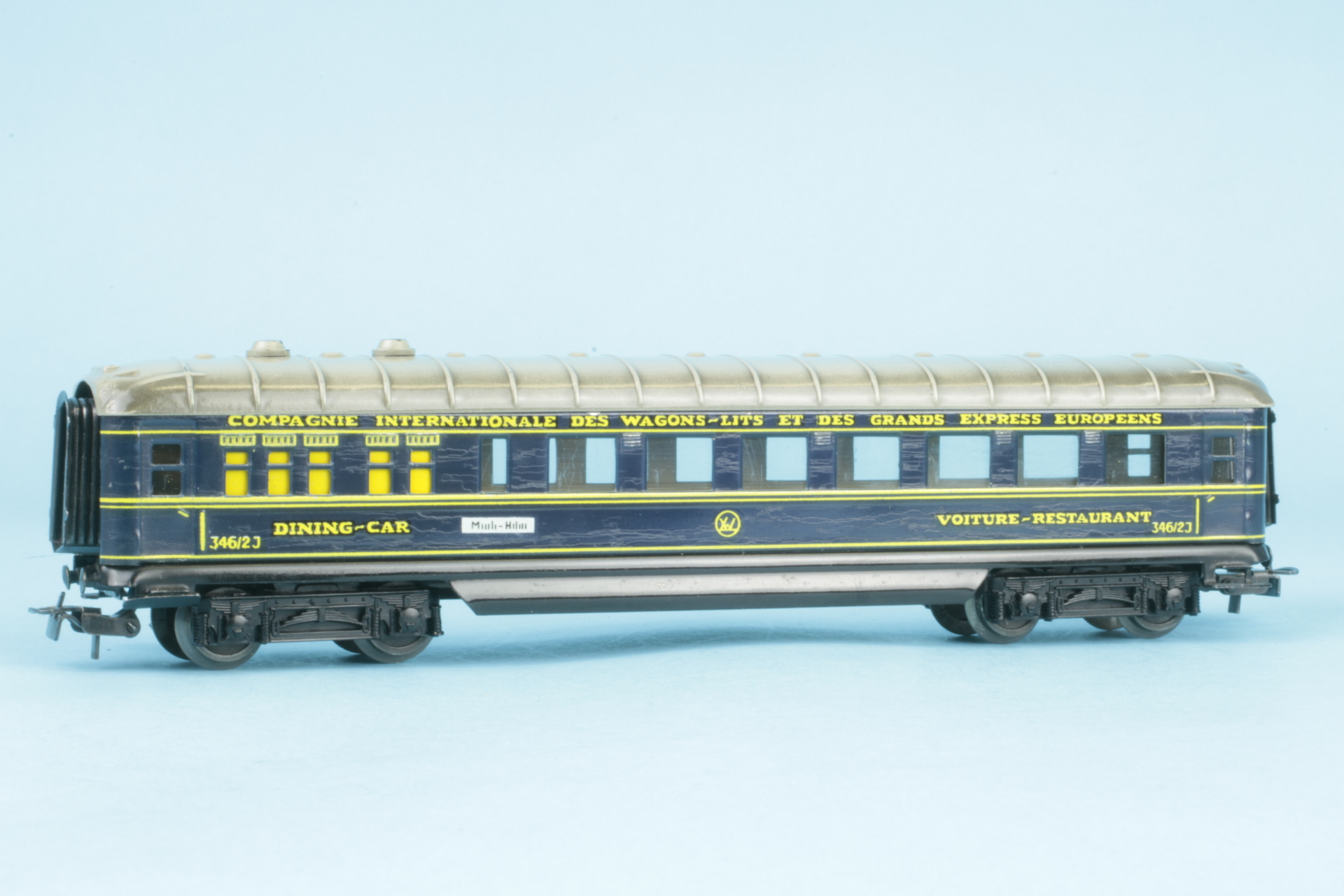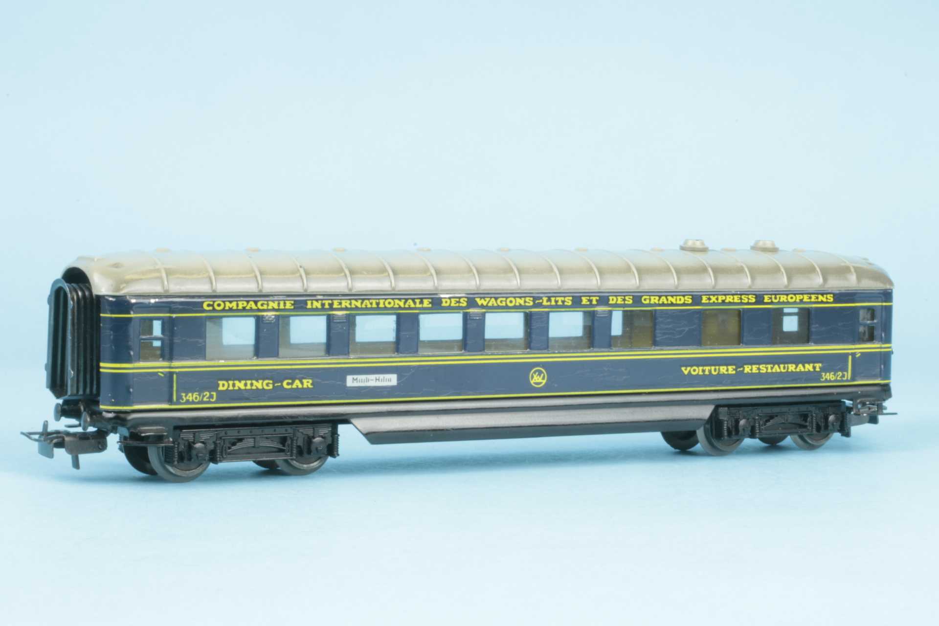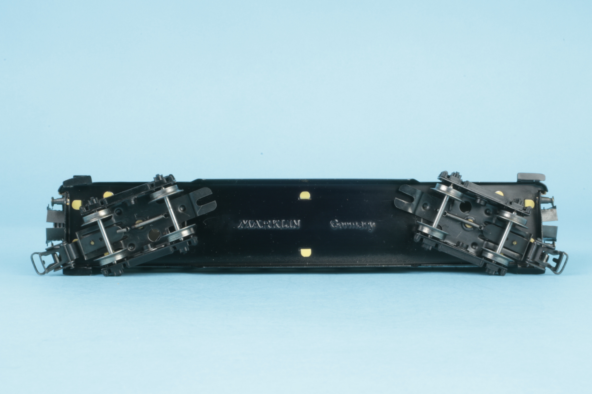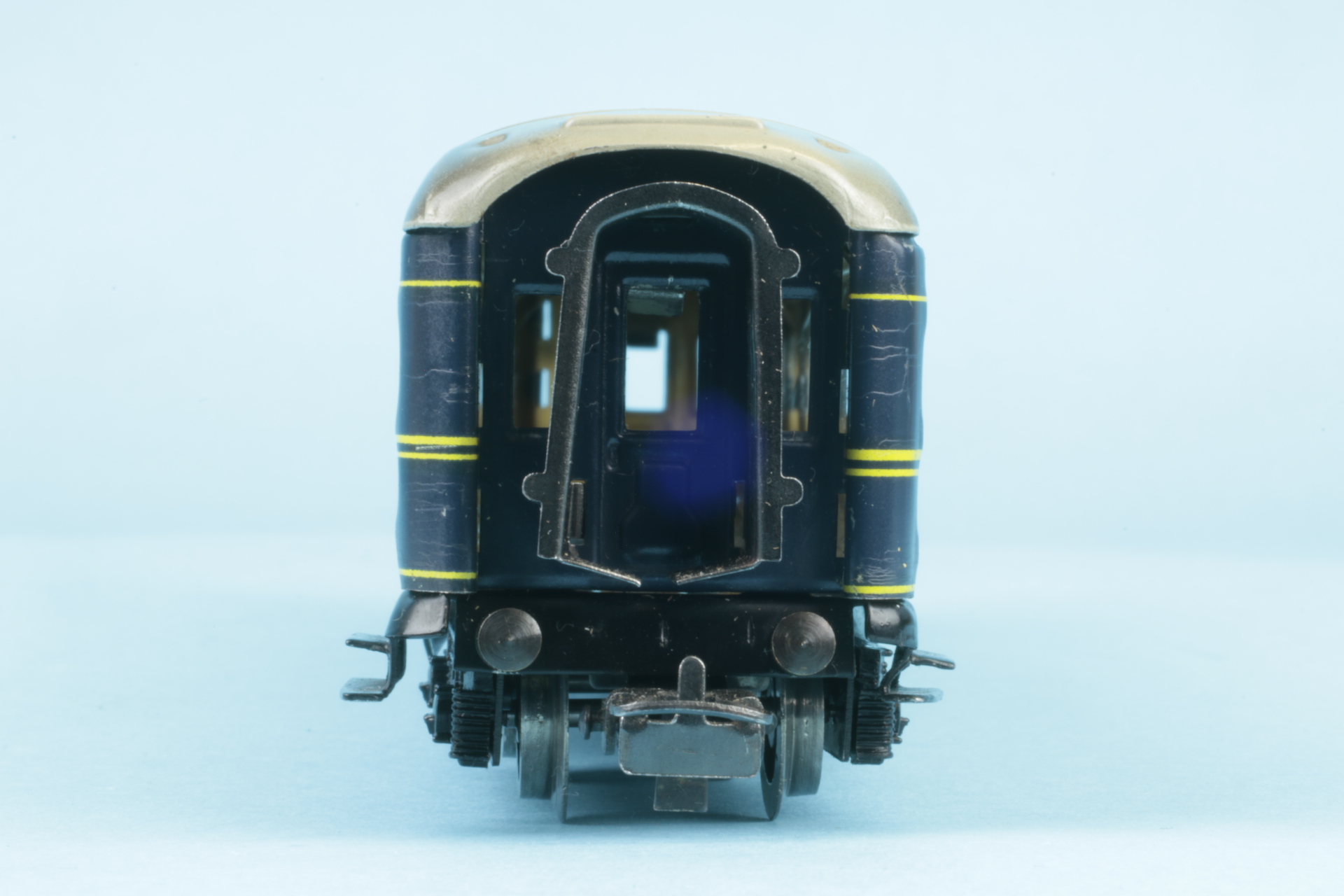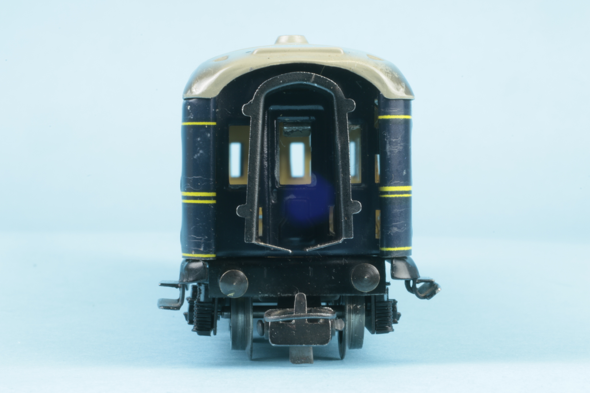Drehgestelle mit Kunststoffwangen und Radsätzen mit Nadellager. Drehgestelle befestigt mit Benzingsicherungen. Zuglauftafeln nicht geprägt. Bauzeit 1956. Wagenkasten mit einigen Schlieren. Im Originalkarton (Boden mit Klebeband repariert).