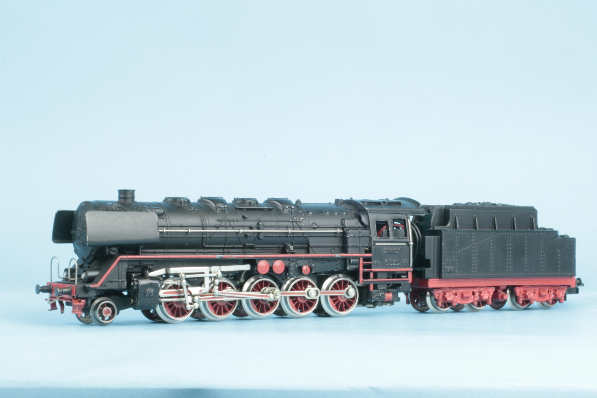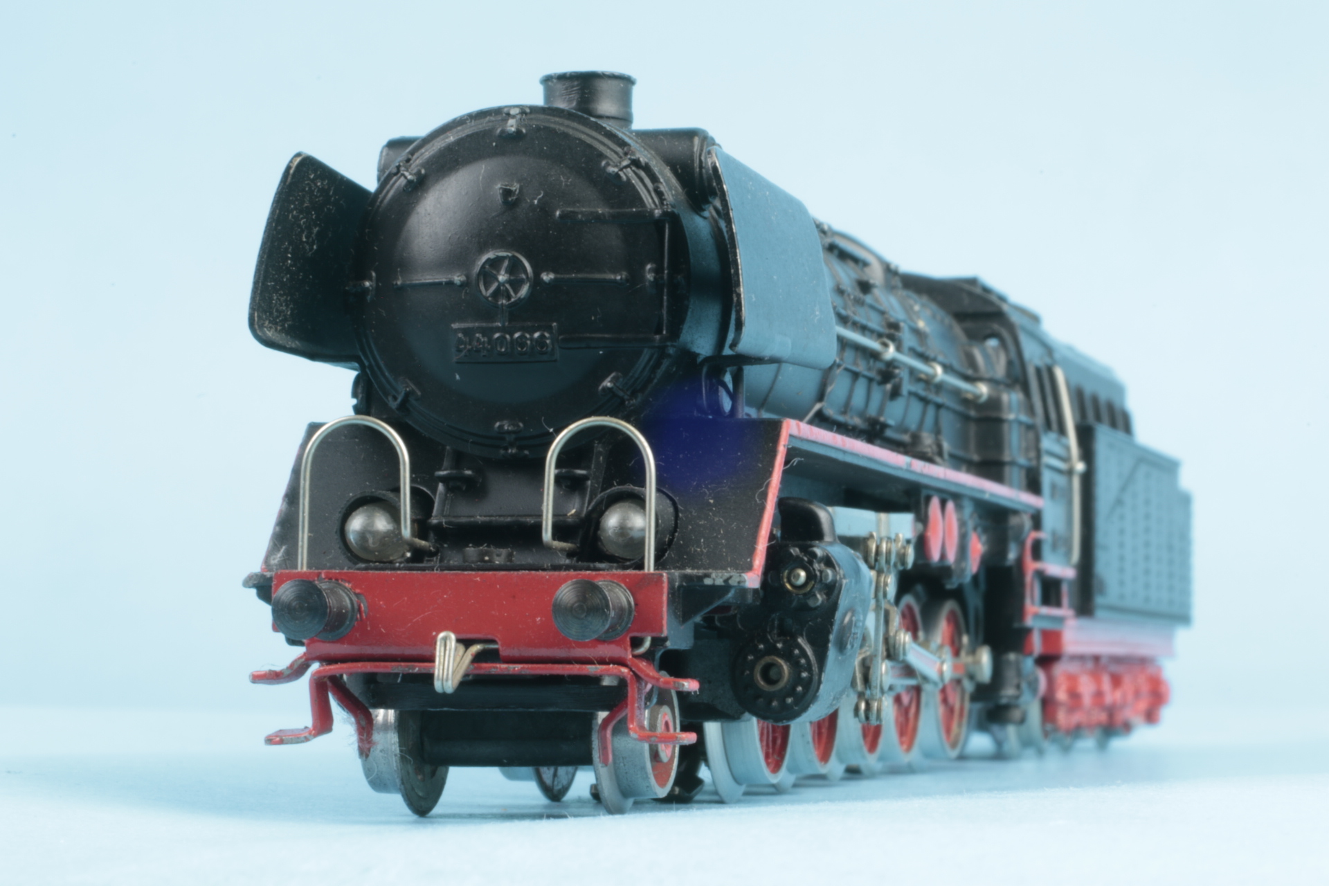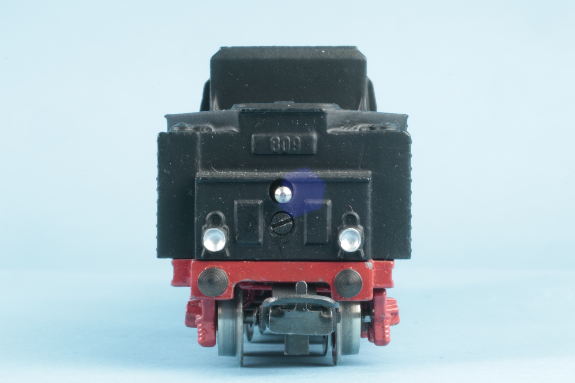 Gusstenderhaube, 2 Zungenschleifer, Version ohne Haftreifen. Bauzeit etwa 1950. Der Tenderaufbau wurde bei uns neu lackiert. Lokomotivaufbau mit kleineren Farbschäden. Schleifer mit Gebrauchsspuren. Funktionsgeprüft.