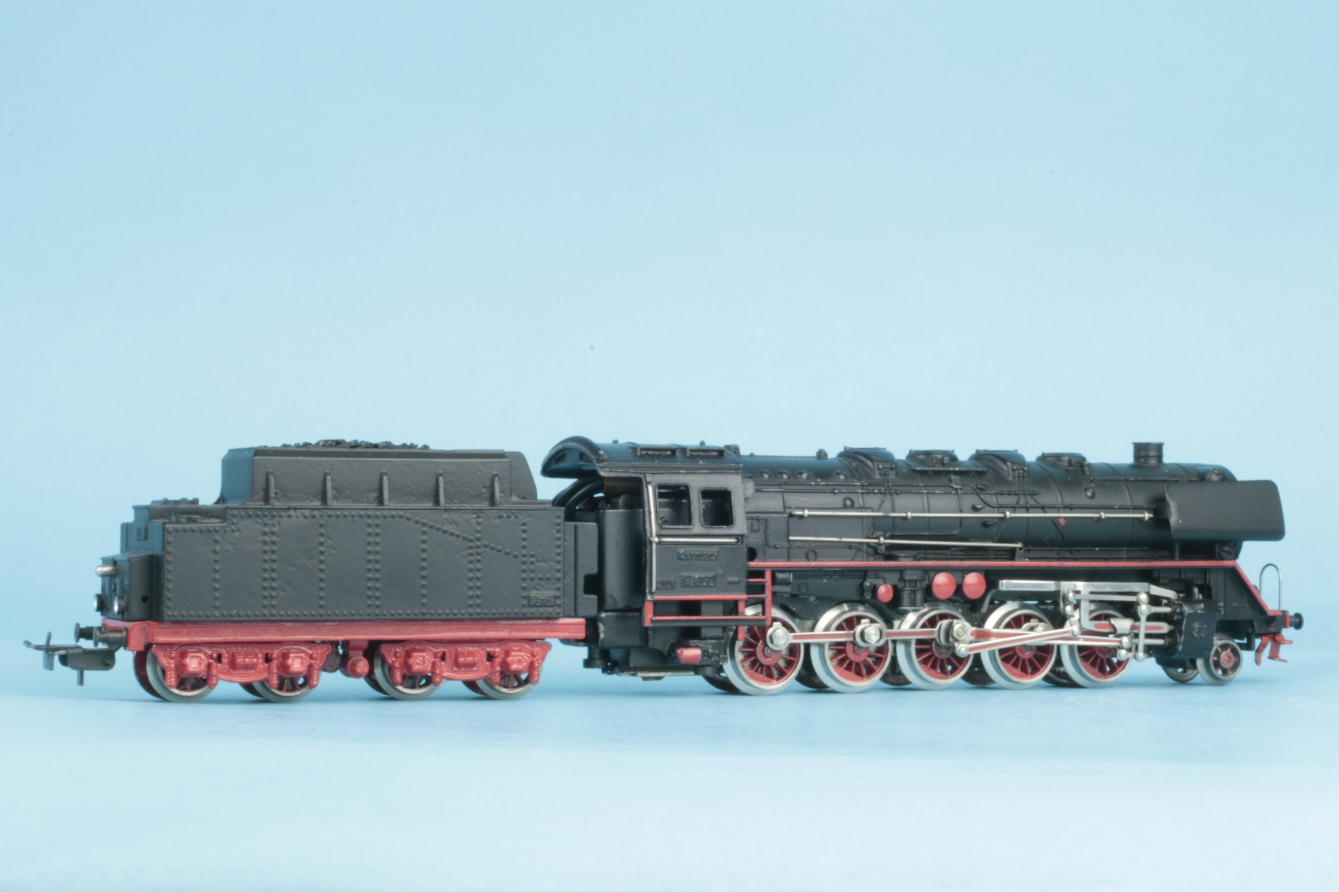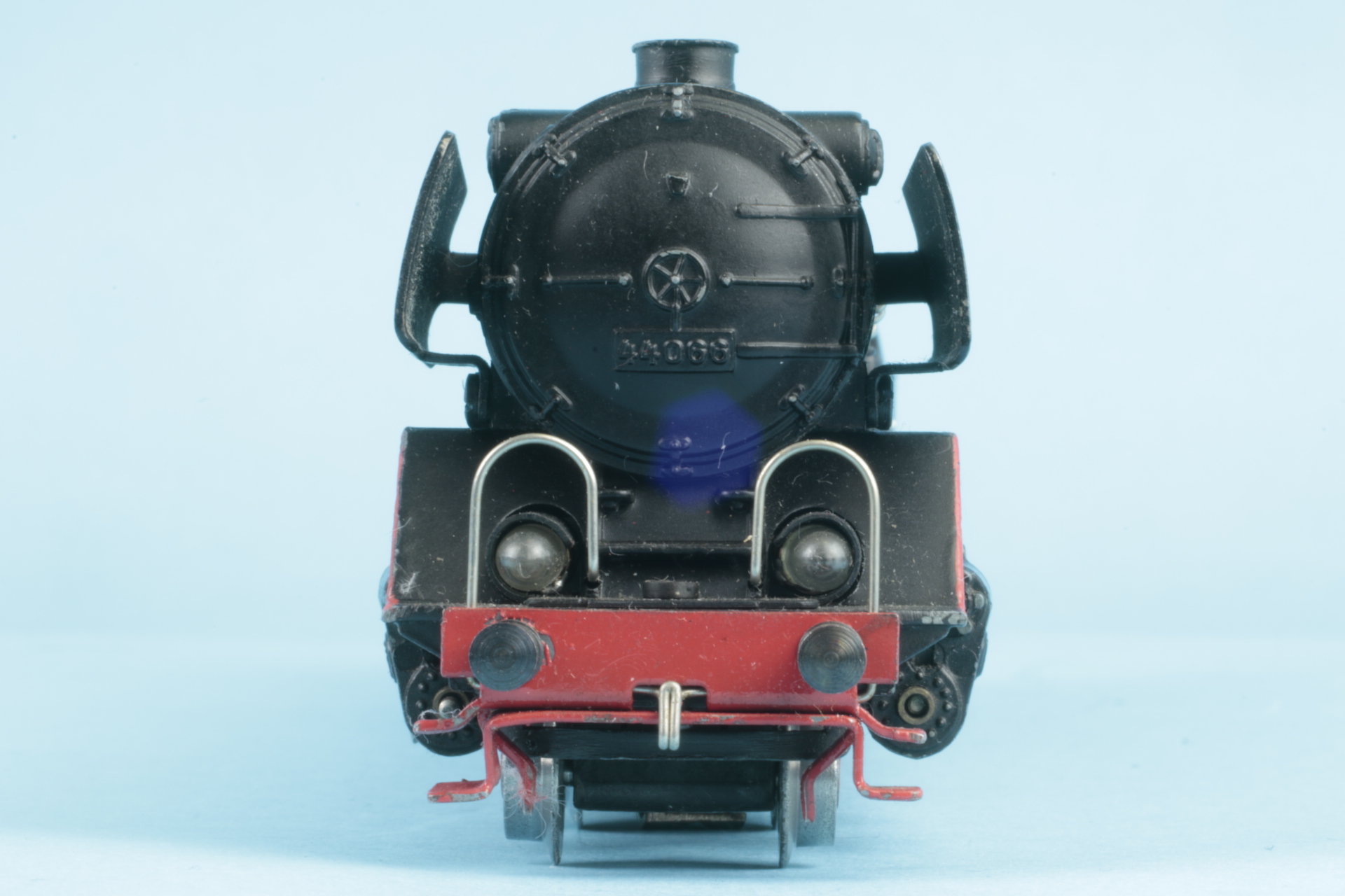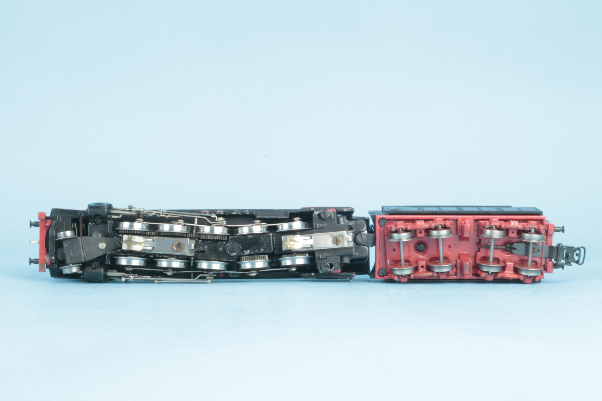 Gusstenderhaube, 2 Zungenschleifer, Version ohne Haftreifen. Bauzeit etwa 1950. Der Tenderaufbau wurde bei uns neu lackiert. Lokomotivaufbau mit kleineren Farbschäden. Schleifer mit Gebrauchsspuren. Funktionsgeprüft.